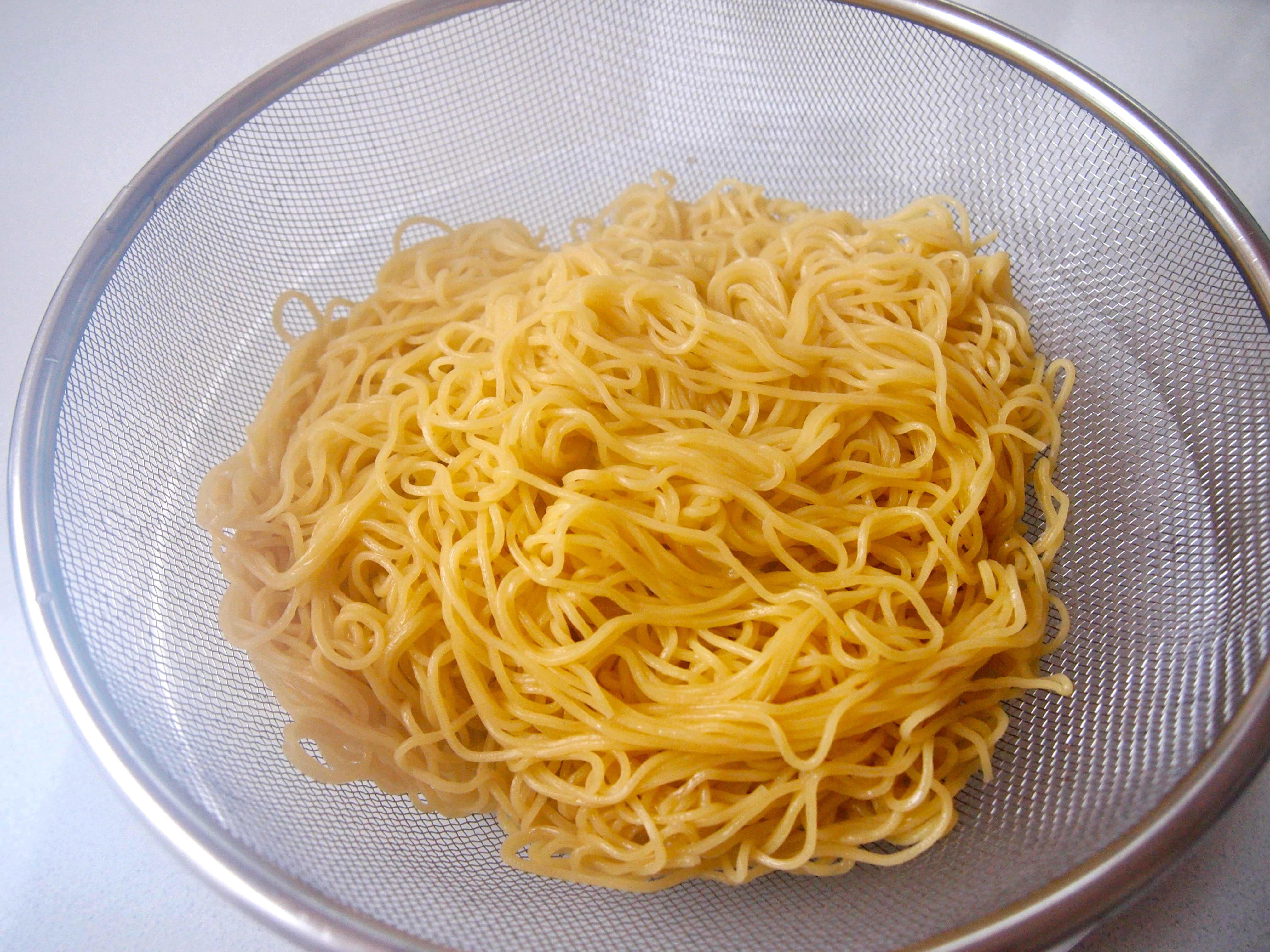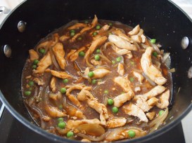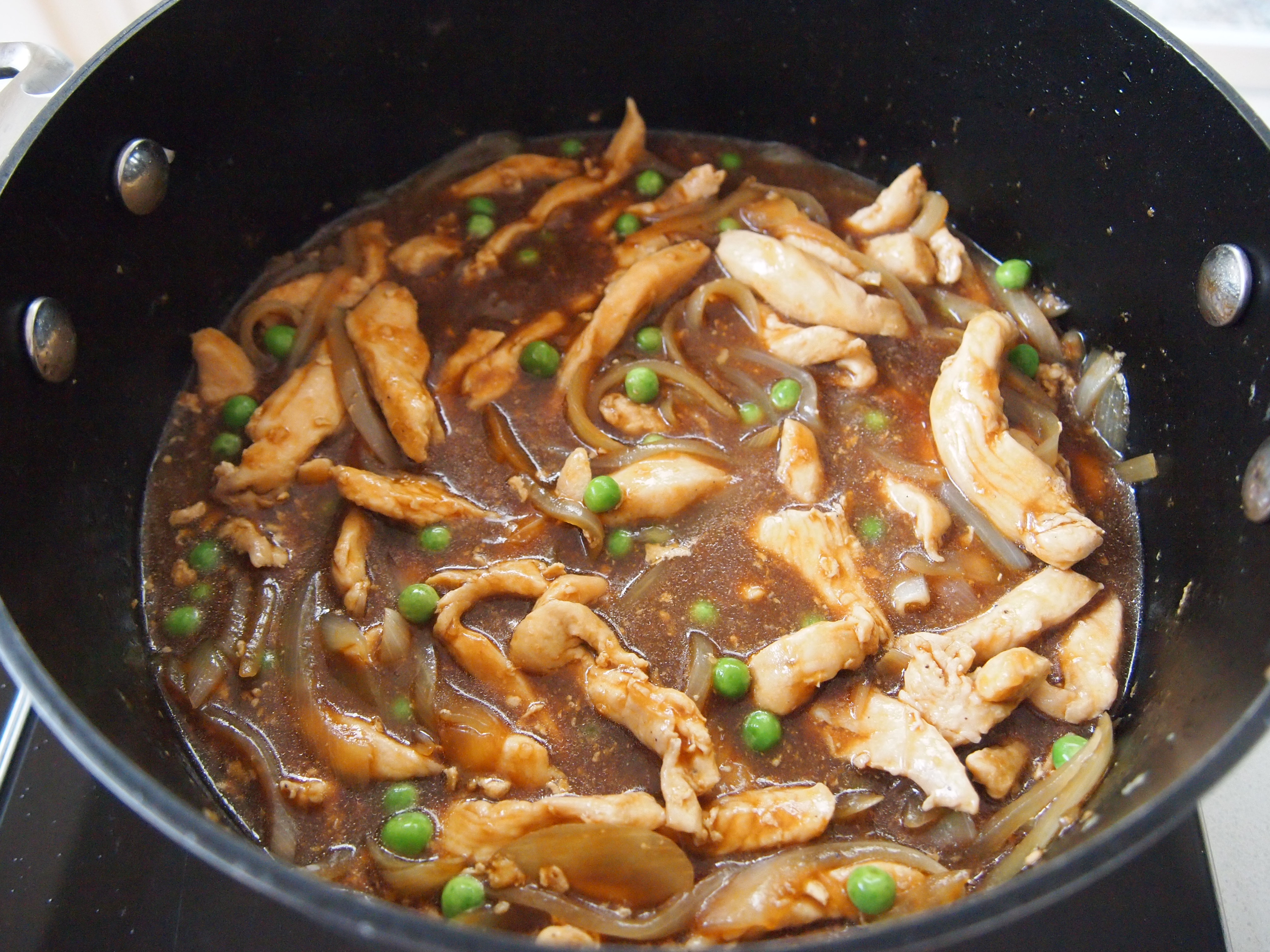 In a medium size saucepan heat about 3 tablespoons of oil. When hot add the onions and the first measure of salt. Saute for at least 5 minutes or until the onions have softened, being careful to not get any colour on them. Remove the onions with a slotted spoon and set aside. To the oil remaining in the pan (add a touch more if you need to) add the garlic and cook until the garlic is starting to brown, and in this instance it’s good to get a little colour on the garlic; then add the chicken and cook stirring often, over medium heat, until the chicken has changed colour. Return the onions to the pan and mix well. In a small bowl mix the water, cornflour, second measure of salt, dark soy sauce and sesame oil. Stir until the cornflour has dissolved and add the mixture to the chicken along with the frozen peas. As soon as it comes to the boil, reduce the heat to a low simmer and cook covered for 10-15 minutes. Whilst the sauce is cooking start frying the noodles (or you can make the sauce ahead of time and reheat when ready to serve).
