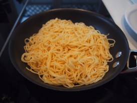 Heat 2 tablespoons of oil in a small non stick skillet or fry pan – I like to use a pan that is plate size and make a noodle cake for each person but you can make larger cakes if you wish. When the oil is hot, add enough of the cooked noodles to thickly cover the base of the pan, a thickness of about 2-3 cm is good. Cook over medium high heat, undisturbed for a few minutes or until the base of the noodles has turned golden brown. At this stage the cake will be easy to turn as the base has set. Cook the other side for a few more minutes until golden as well; you will end up with a firm cake, crispy on the outside but soft in the centre.