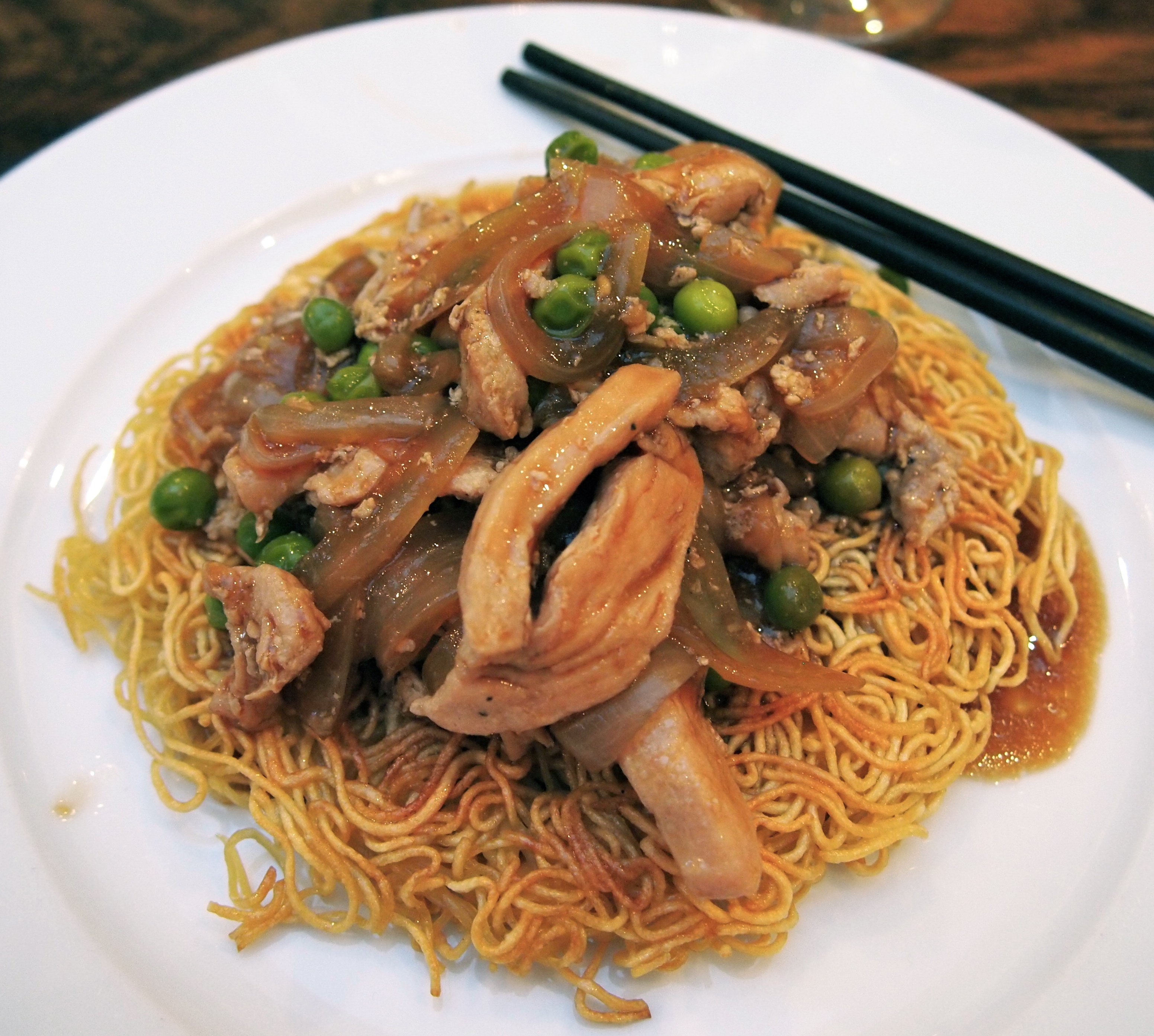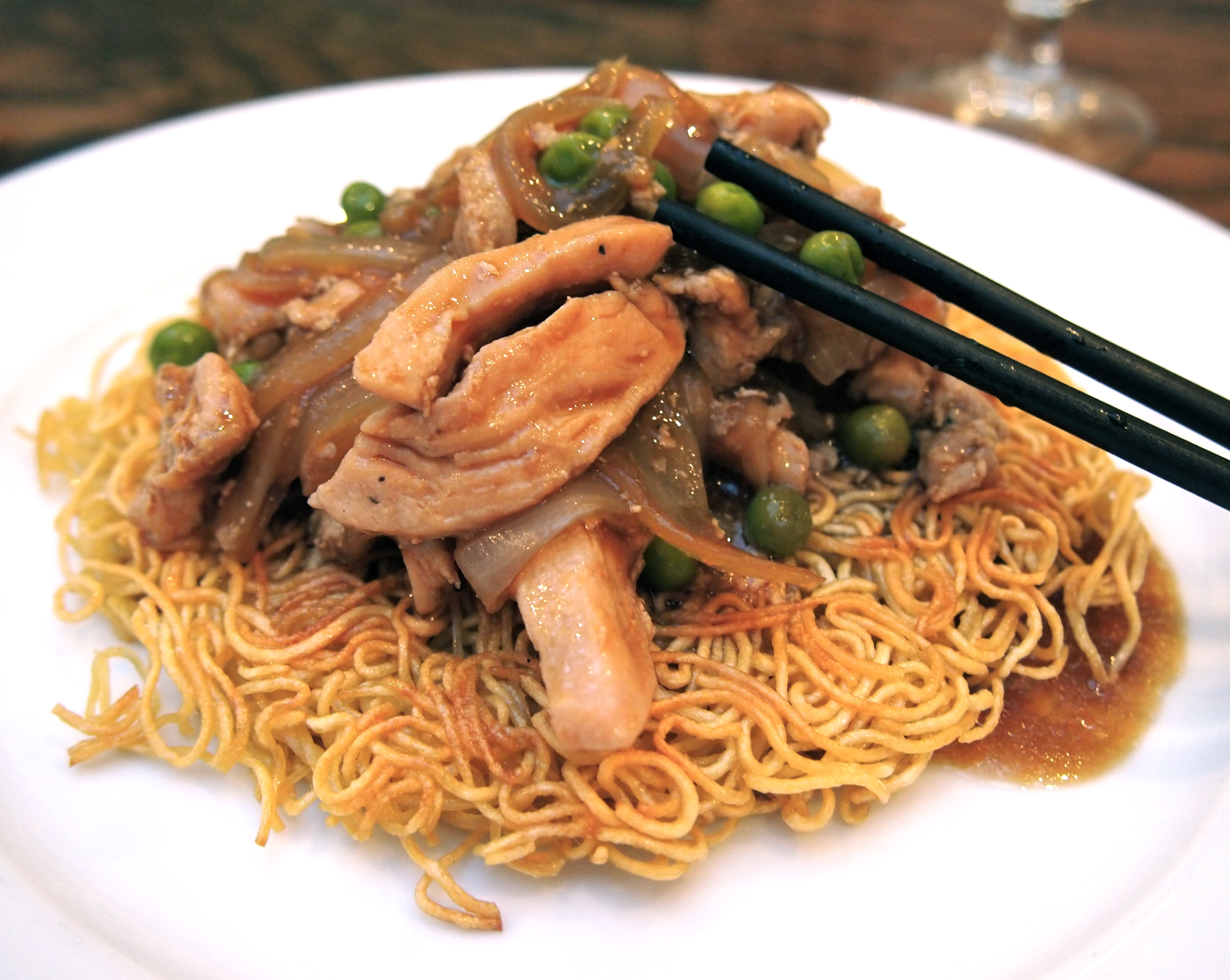 Transfer to a serving plate and keep warm (I like to put the fried noodle cakes in a warm oven until they are all done). Fry the remaining noodles in the same way, adding more oil to the pan for each cake. You should end up with 2 -3 cakes depending on the thickness. When all the cakes have been fried place one on each plate and top with a generous serving of the hot chicken sauce and serve straight away.