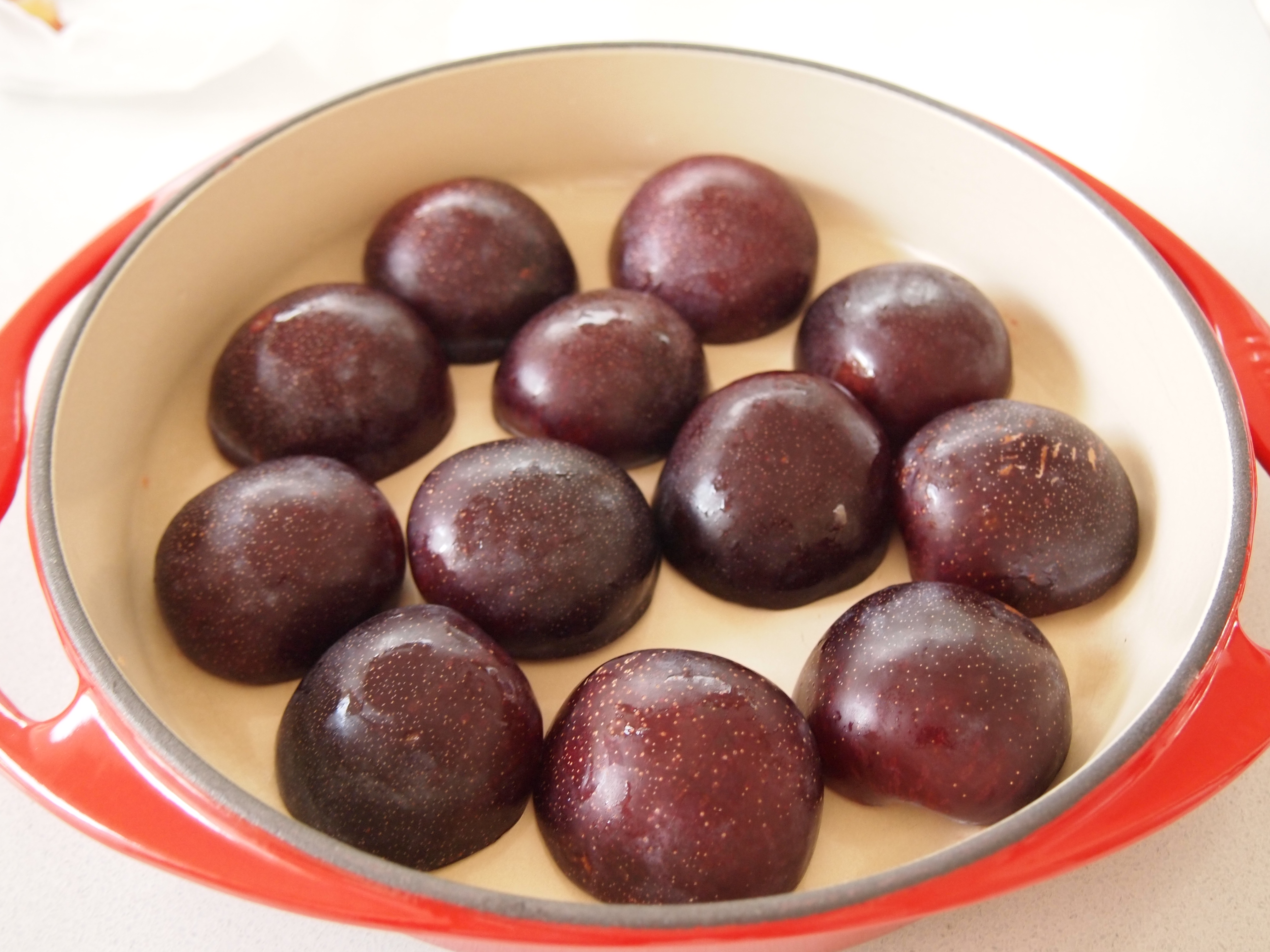Preheat the oven to 180C. Generously butter a 9-inch glass pie dish ( I used my Le Creuset cast iron tart tatin dish) and arrange the plums in the dish, cut side down. Combine 1 cup of the sugar and ⅓ cup water in a small saucepan and cook over high heat until it turns a warm amber colour. Swirl the pan but don’t stir. Pour evenly over the plums.
