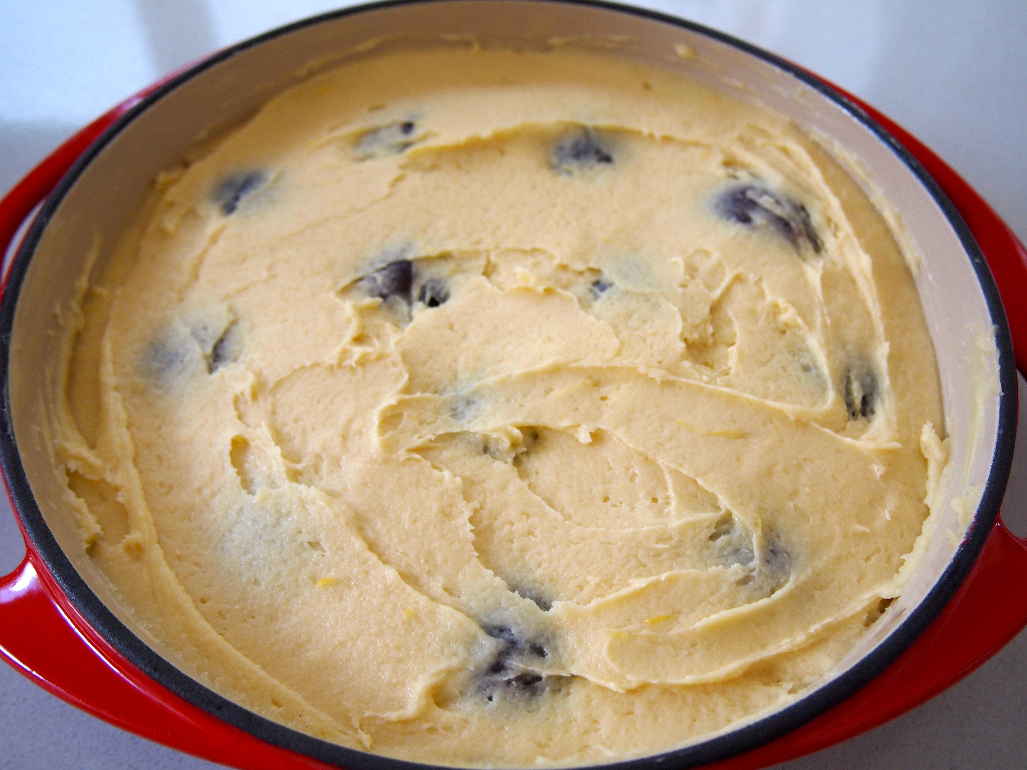 Meanwhile, cream the butter and the remaining ¾ cup of sugar in the bowl of an electric mixer fitted with the paddle attachment, until light and fluffy. Lower the speed and beat in the eggs one at a time. Add the sour cream, lemon zest, and vanilla and mix until combined. Sift together the flour, baking powder, and salt and, with the mixer on low speed, add it to the butter mixture. Mix only until combined. Pour the cake batter evenly over the plums and bake for 30 to 40 minutes, until a skewer comes out clean.