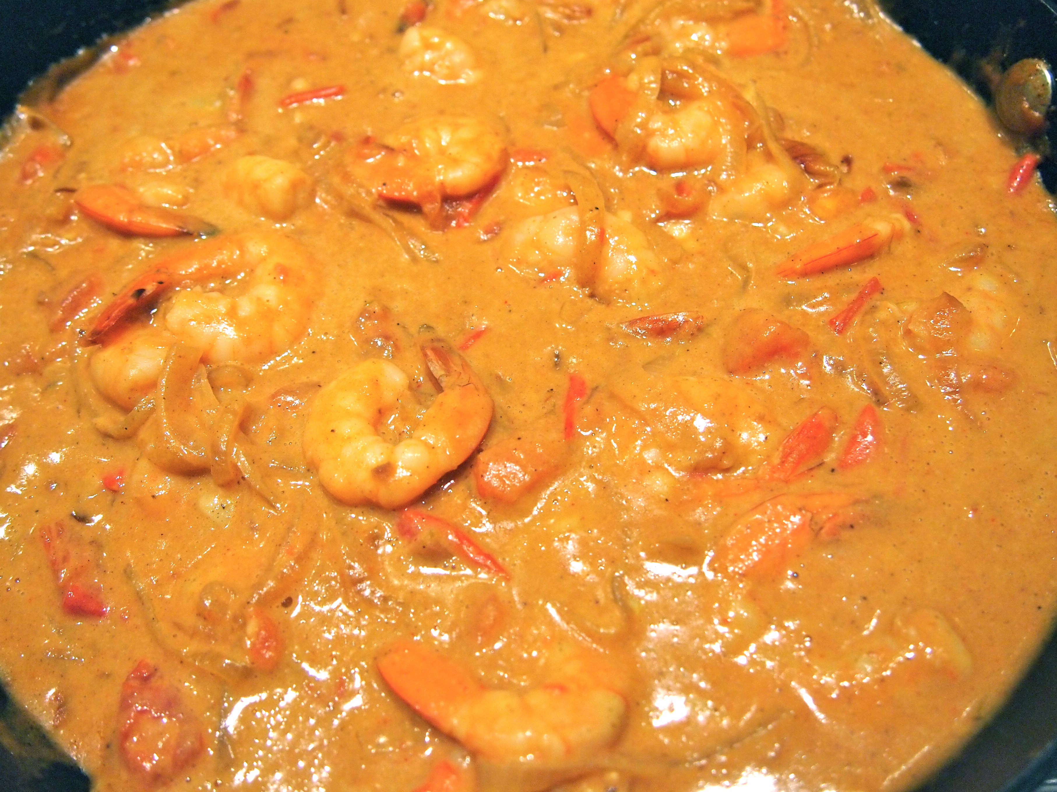 Heat the oil in a medium size fry pan and when hot add the onions and cook until soft; you don’t want to get too much colour on them so stir them frequently and adjust your heat if they start to scorch. Add the garlic and cook for a few more minutes. Add the chilli powder, garam masala, turmeric and curry powder and sauté for a few minutes to cook out the spices. Add the tomatoes, salt, lime juice and zest and cook until the tomatoes have started to wilt. Add the coconut milk, peanut butter and palm sugar. Bring to the boil then reduce the heat and simmer for 15-20 minutes; then add the prawns and simmer again for a further 5-8 minutes until the prawns are cooked through. If your sauce is reducing too much add a touch of chicken stock or cover the pan.