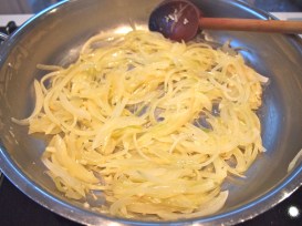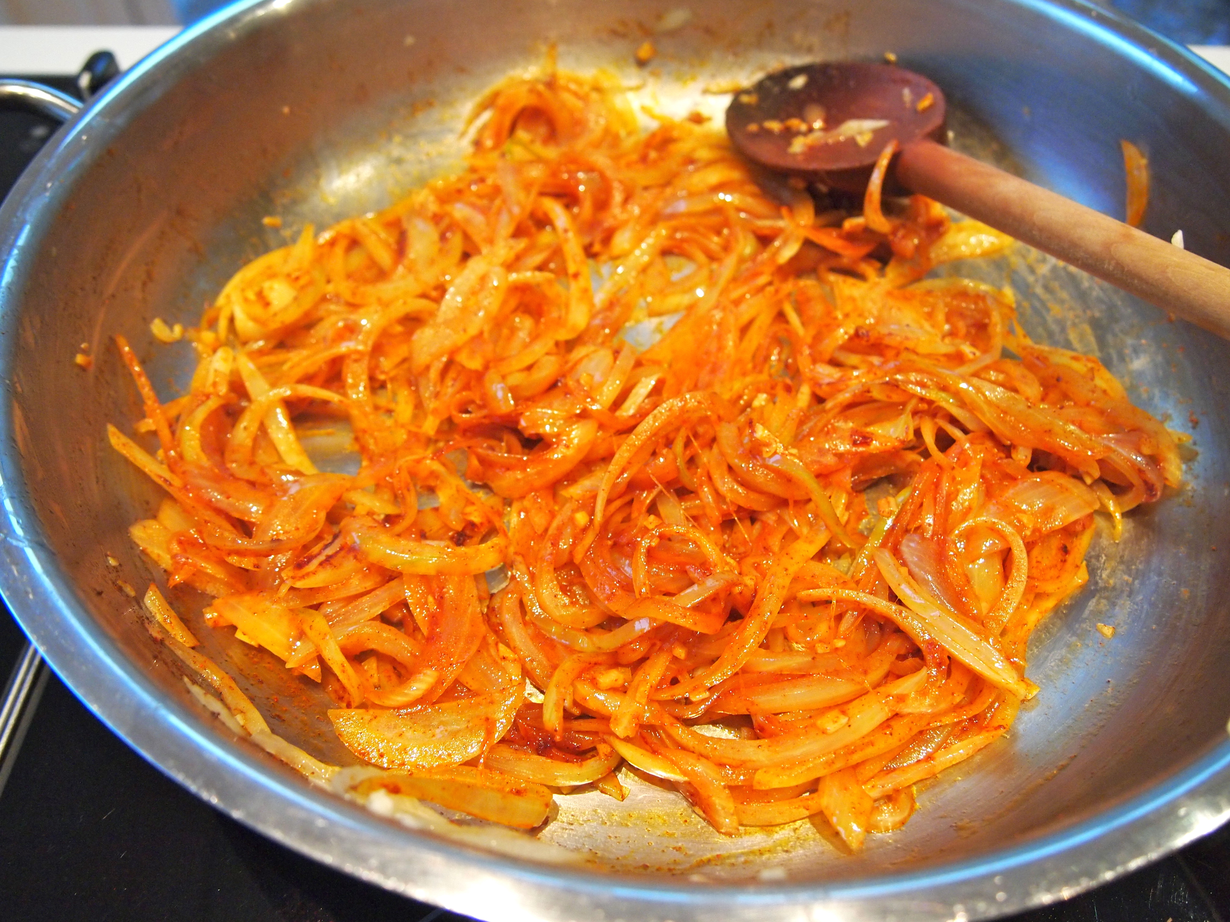 Heat a third of the butter in a medium size skillet or frypan and when melted add the onions and a pinch of salt. Cook on medium low heat for about 10 minutes until the onions are soft, being careful to not get any colour on them. I find it helps to add a couple of tablespoons of water to the onions as the steam aids in getting them soft and wilted without having to add more oil. Just keep stirring and cooking until the water has evaporated and the onions are cooking only in the oil again. Add the paprika and stir to combine and cook for a couple of minutes more. Remove the onions to a bowl and set aside.