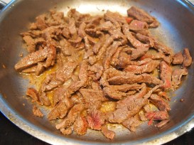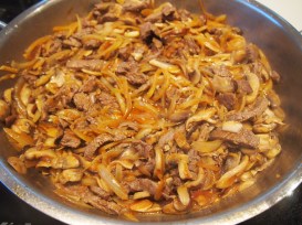 Heat the remaining butter in the frypan along with the olive oil. Turn the heat up and add the beef slices. Cook over high heat stirring the meat around every now and then until the meat has seared and changed colour. Be careful to not overcook the meat at this stage, you just want a slight bit of colour but not to have the beef cooked all the way through. Season the beef with salt and a generous amount of black pepper. Return the onions and mushrooms to the pan and stir to combine. Add the sour cream and bring to a simmer. Cover the pan and cook on low heat for 5 minutes. By this stage the meat will be just cooked through and very tender. If the sauce has thickened too much and you want it to be slightly runnier add a small splash of boiling water and mix well. Sprinkle the stroganoff with the chopped parsley and serve with pasta, rice or French fries.