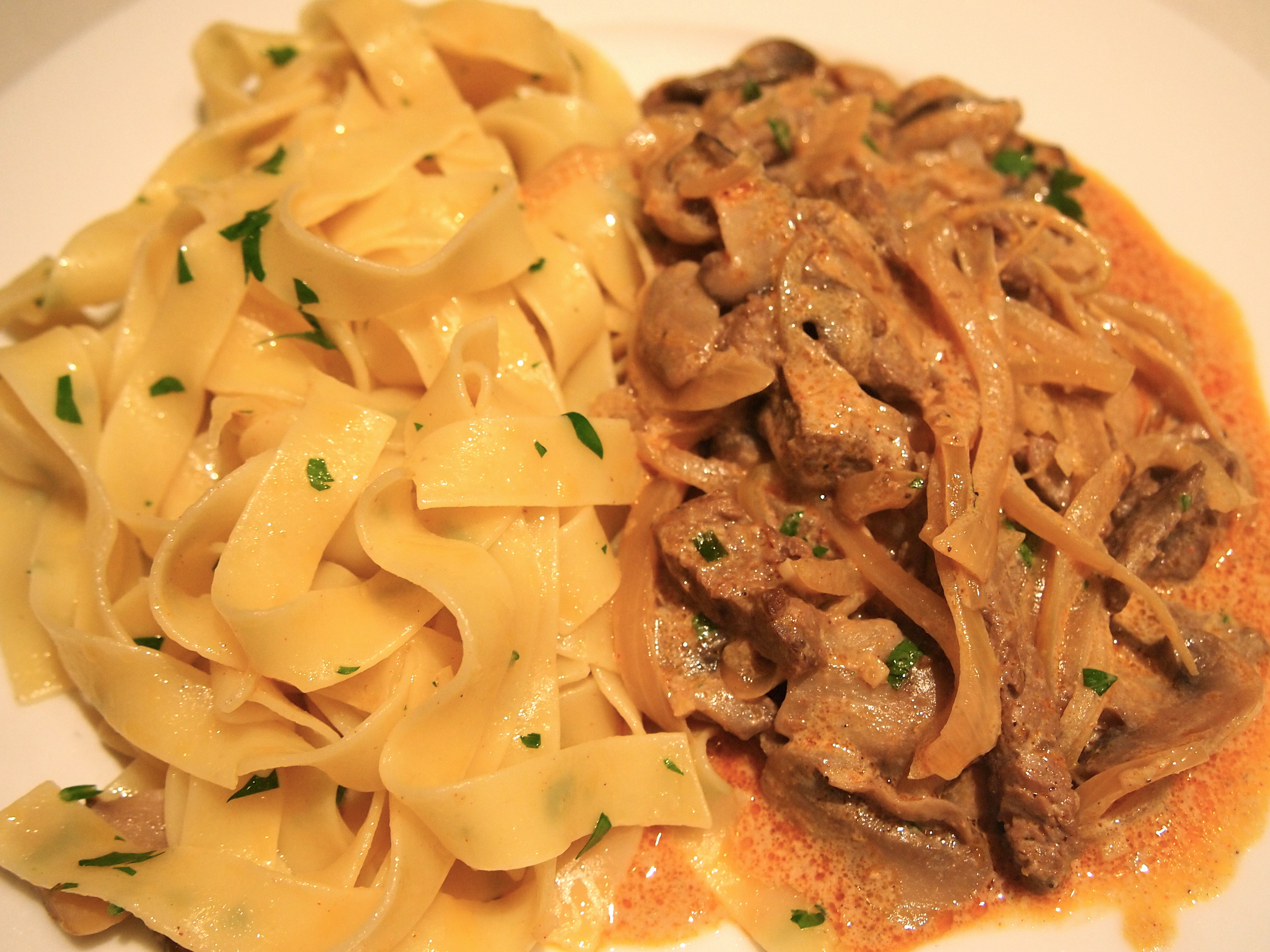 Beef Stroganoff has been around a long time, and by long, I mean since the 1890’s. The dish originated in Russia but quickly became popular in the West, especially in the 1970’s when it was a dinner party standard. It seems to have gone out of fashion since then which is a shame because it’s a delicious and fast meal to prepare. I grew up eating a lot of Stroganoff as my mother is part Russian. My mother uses lamb fillets instead of beef as it was more readily available in Iran where she spent much of her life – she still uses lamb fillets (and an astonishing amount of cream!) and serves the Stroganoff in the very traditional and classic way which is with thinly cut French fries. This combination isn’t actually as strange as you’d think; the tender beef in the creamy sauce being a great contrast to the crispy potatoes. Over the years the recipe for beef Stroganoff has been really messed about, with everything from red peppers to wine being added into the mix. But the original recipe is perfect in it’s simplicity; onions, beef, paprika, mushrooms and sour cream – that’s it, nothing more and nothing less is required. I serve my Stroganoff with buttered fettucini which strictly speaking isn’t authentic but after the addition of the sour cream it feels far too decadent to pair it with French fries. Whatever you decide to serve your Stroganoff with, be it rice, pasta or French fries, it’ll be delicious and a dish worthy of bringing back into fashion.