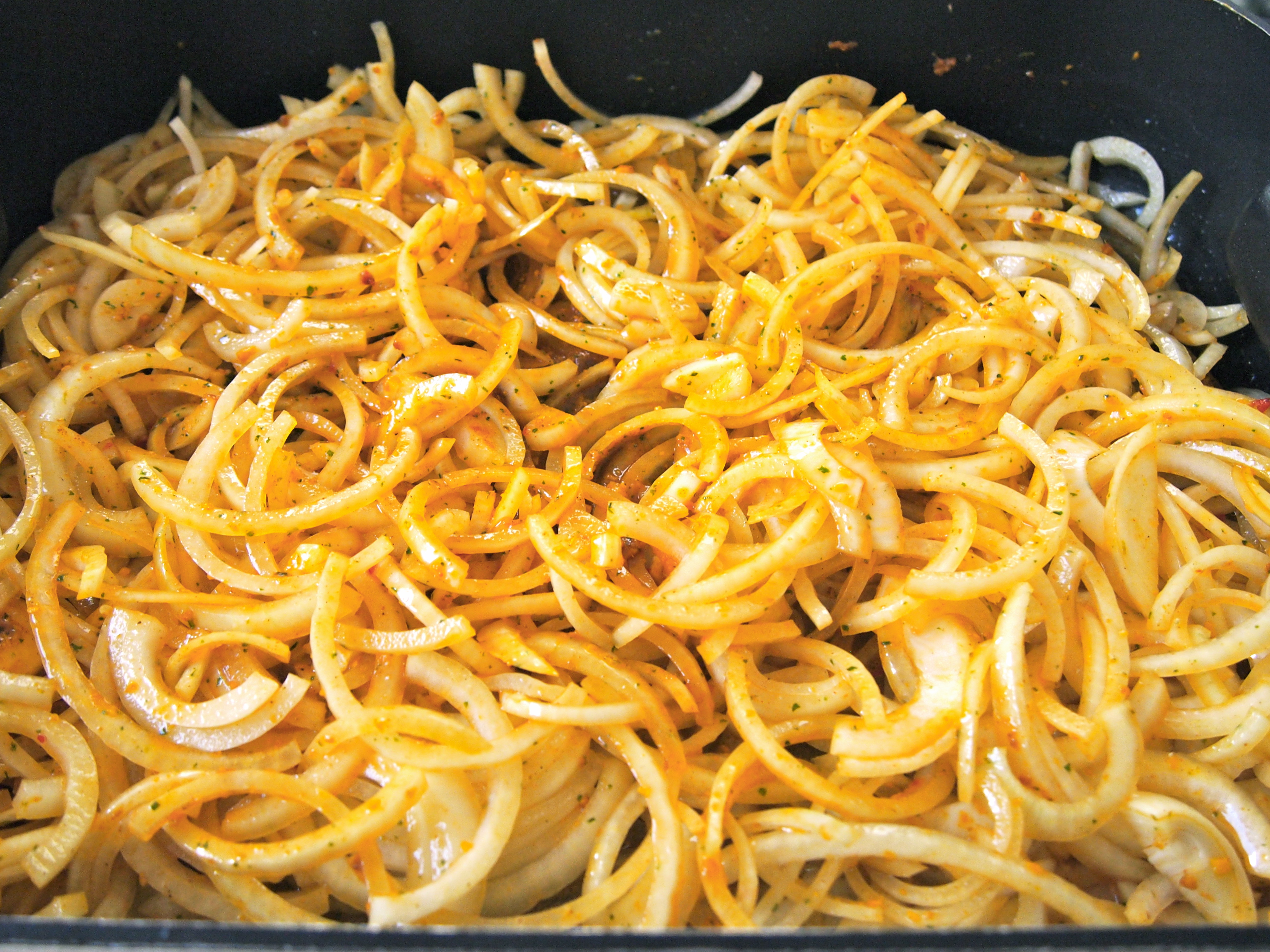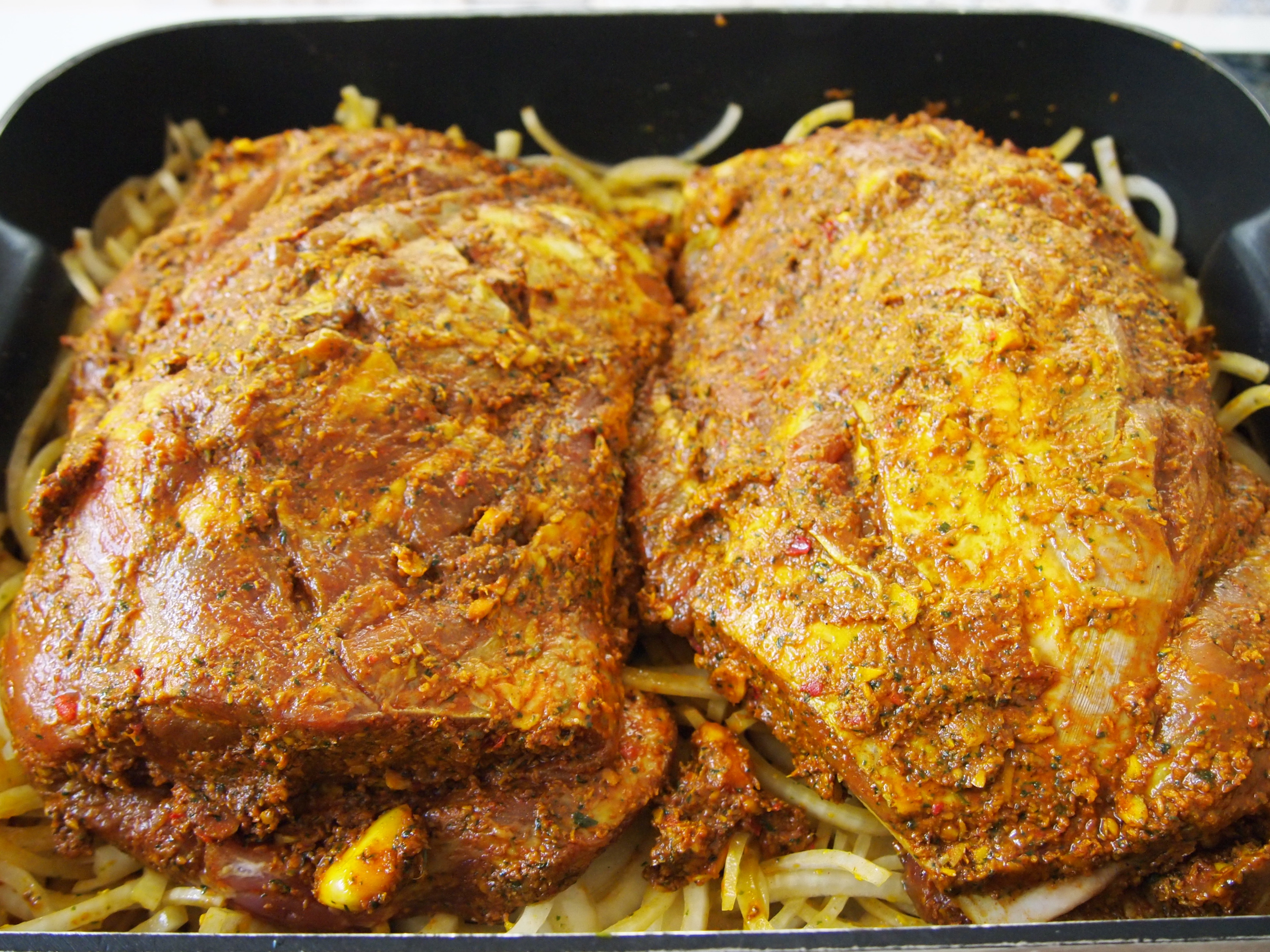 When ready to cook, take the lamb out of the fridge to come to room temperature. Preheat the oven to 170C (or 160C fan force). In a deep roasting pan just large enough to hold the lamb (if the pan is too big the onions will burn) arrange the onions slices on the bottom and drizzle with the oil. Season with a little salt and add a heaped tablespoon or two of the left over tikka paste. Stir to coat the onions with the oil and seasonings and place the lamb on top, fat side up. Loosely cover with a piece of wet greaseproof paper and cook, basting occasionally for around 4 hours or until the coating is dark and gnarly and the meat very tender. When the lamb is about an hour away from being ready, add the sugar to the onions and stir around a little, this will help them caramelise a bit more and add a nice touch of sweetness to the sauce. I also tend to remove the baking paper at around the same time so as the meat has a chance to get a nice crust. Lamb shoulder is a pretty forgiving cut so if you want to cook it for longer just turn the heat down a bit. I always put it in about 5 – 5.5 hours before I need to serve it just to make sure I really get it to the falling off the bone stage.
