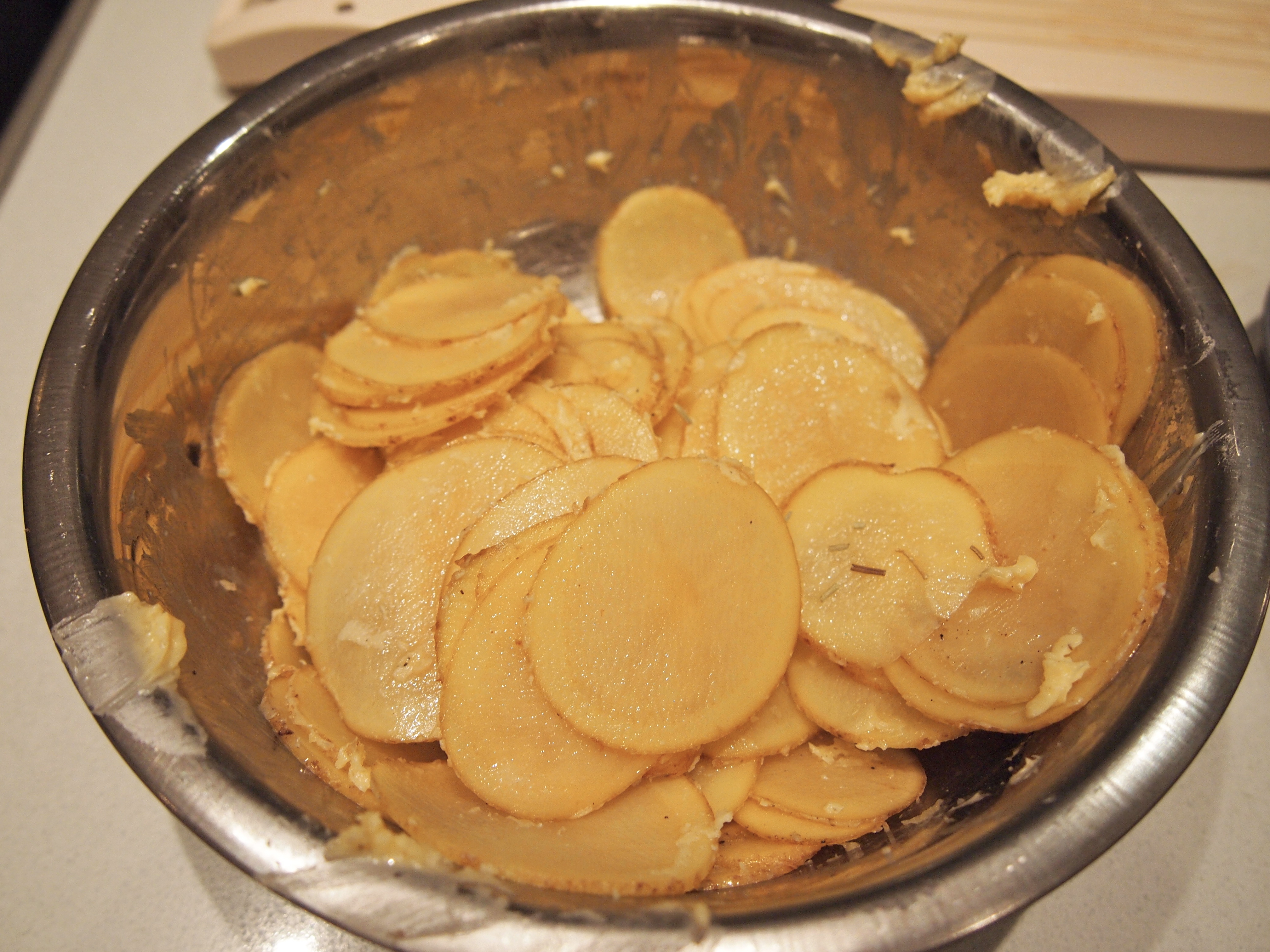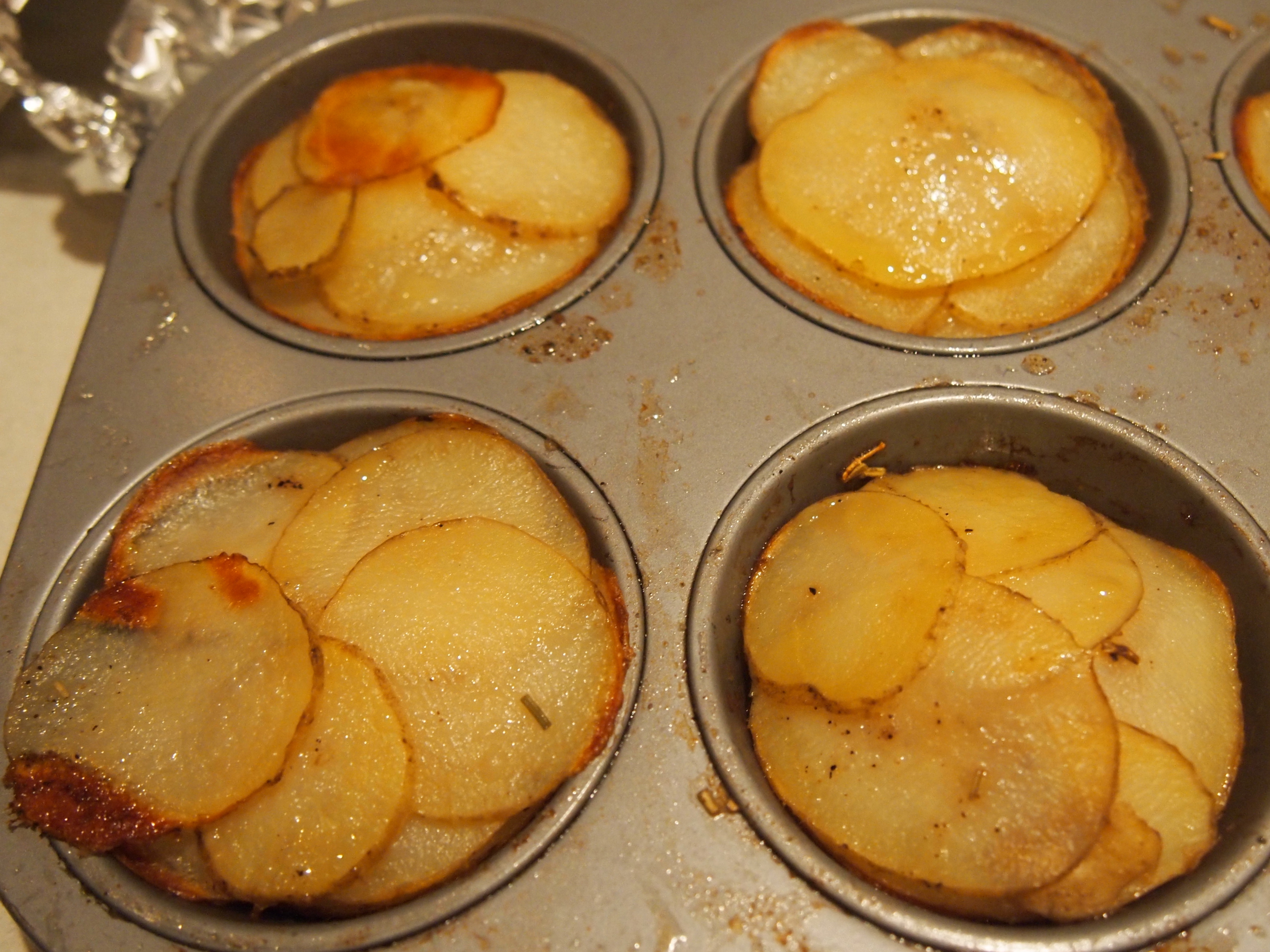Pre-heat oven to 200C. Using a mandolin or V slicer cut the potatoes into very thin evenly sized rounds. Using some of the butter, thoroughly grease a 12 hole muffin tin (it’s important that the tins are well greased otherwise it’ll be hard to remove the potatoes later) and place a little rosemary into the bottom of each hole. Place the potatoes into a large bowl, add the remaining butter, salt and pepper and toss well, ensuring that each piece of potato is coated with some of the butter.