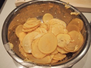 Starting in the centre of a muffin hole form the first layer by overlapping each slice of potato in a circular pattern. Arrange the second layer working in the opposite direction of the first. Continue layering potatoes in opposite directions, pressing down on each layer along the way until pan wells are filled to the top. The potatoes will shrink down once they are cooked so pressing down lightly will enable you to fit in more slices.