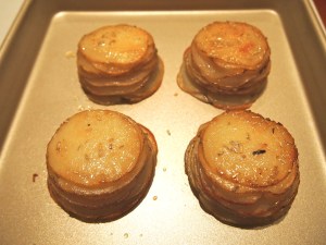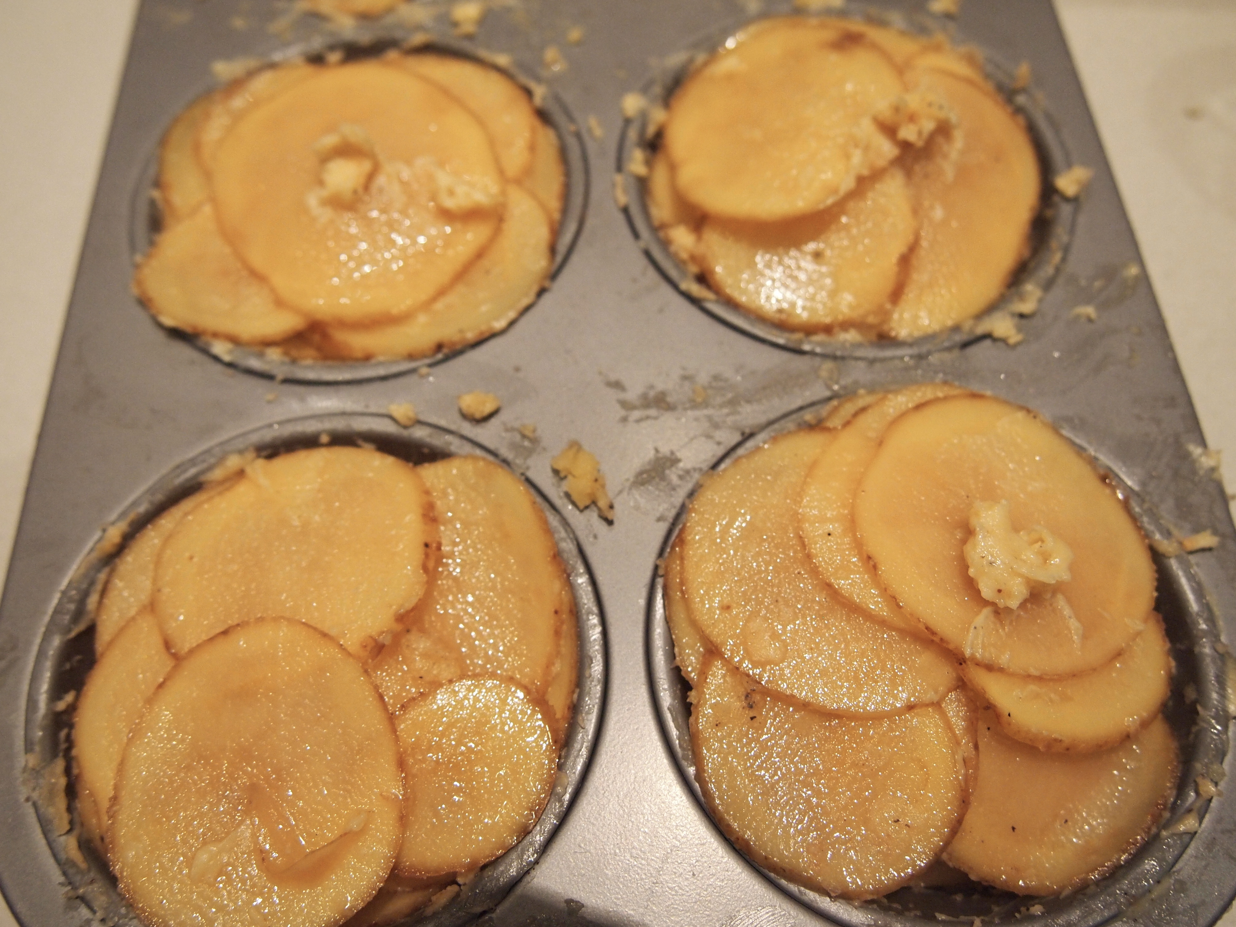 Cover the muffin pan with foil and bake for 30 minutes. Remove from the oven and carefully lift off the foil. Place a baking sheet on top of the muffin tin and carefully invert the tin onto the tray. The potato stacks should pop out onto the baking sheet, a few slices may go astray and you may need to reassemble them slightly, which is easily done.