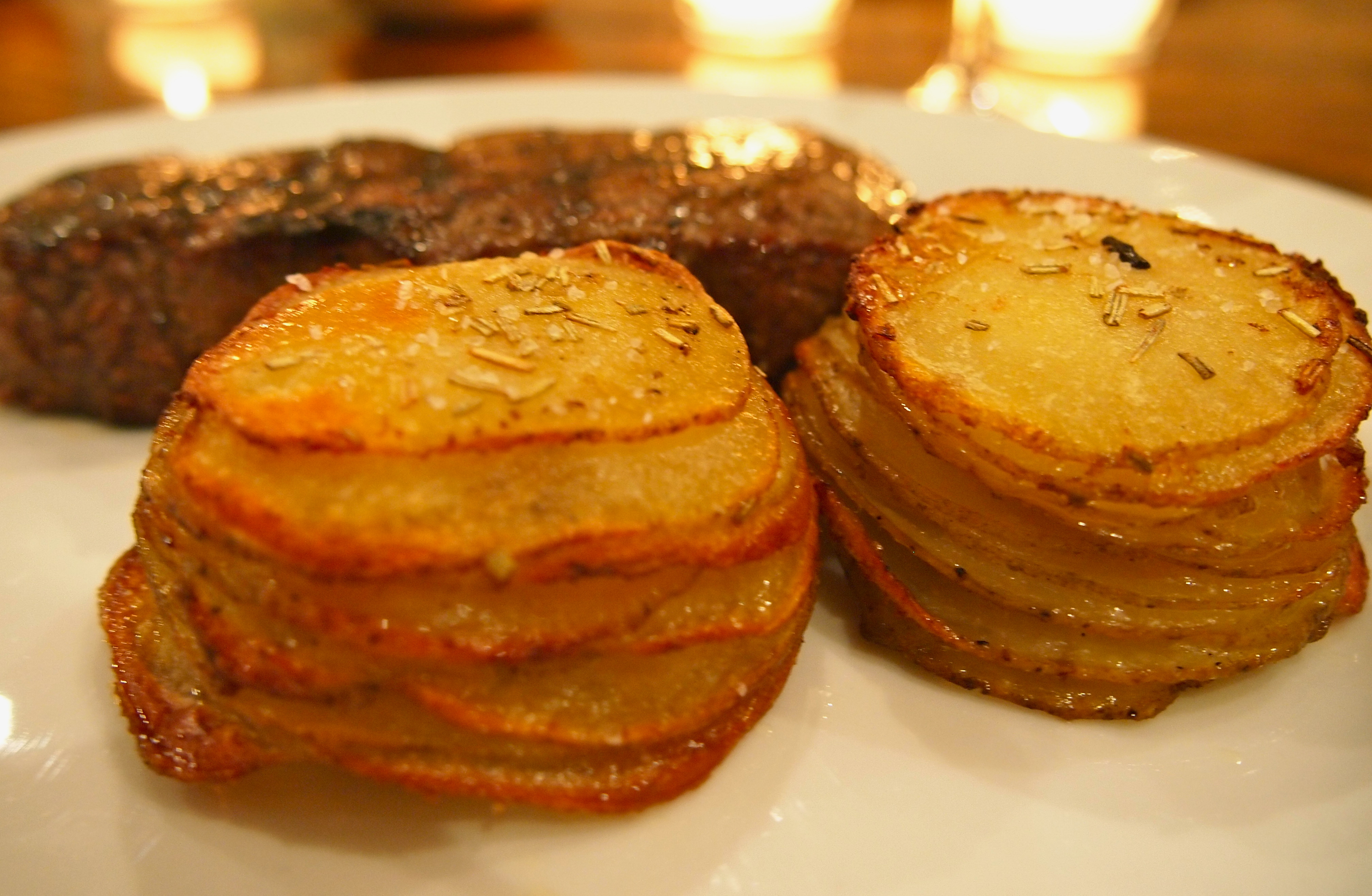 Mini Pommes AnnaI’m always searching for new ways to make potatoes. As much as I love them roasted and mashed it can get a bit boring. Pommes Anna is a traditional French side dish of potatoes which have been very thinly sliced, coated in butter and then neatly layered in a skillet where they are first cooked on the stove top and then transferred to the oven to finish off. The final dish is carefully inverted onto a serving plate – the appearance being that of a cake made of golden potatoes with a crisp top and bottom and perfectly cooked potatoes in the middle. It’s very delicious. These mini ones are a take on the classic but I think they’re easier to prepare and they look fabulous plated individually. This recipe is great if you’re entertaining as the potatoes can be prepared and roasted ahead of time and then finished off again in the oven just before serving. I recommend using slightly waxy potatoes as they’ll hold their shape better and a mandolin is by far the easiest way to get the potatoes very thinly and evenly sliced. I make these in a muffin tin, so they’re not that big and you’ll need at least two per serve, but safer to count on three per person. The good news is that because the potatoes are so thinly sliced there’s roughly the equivalent of only one potato per serving!