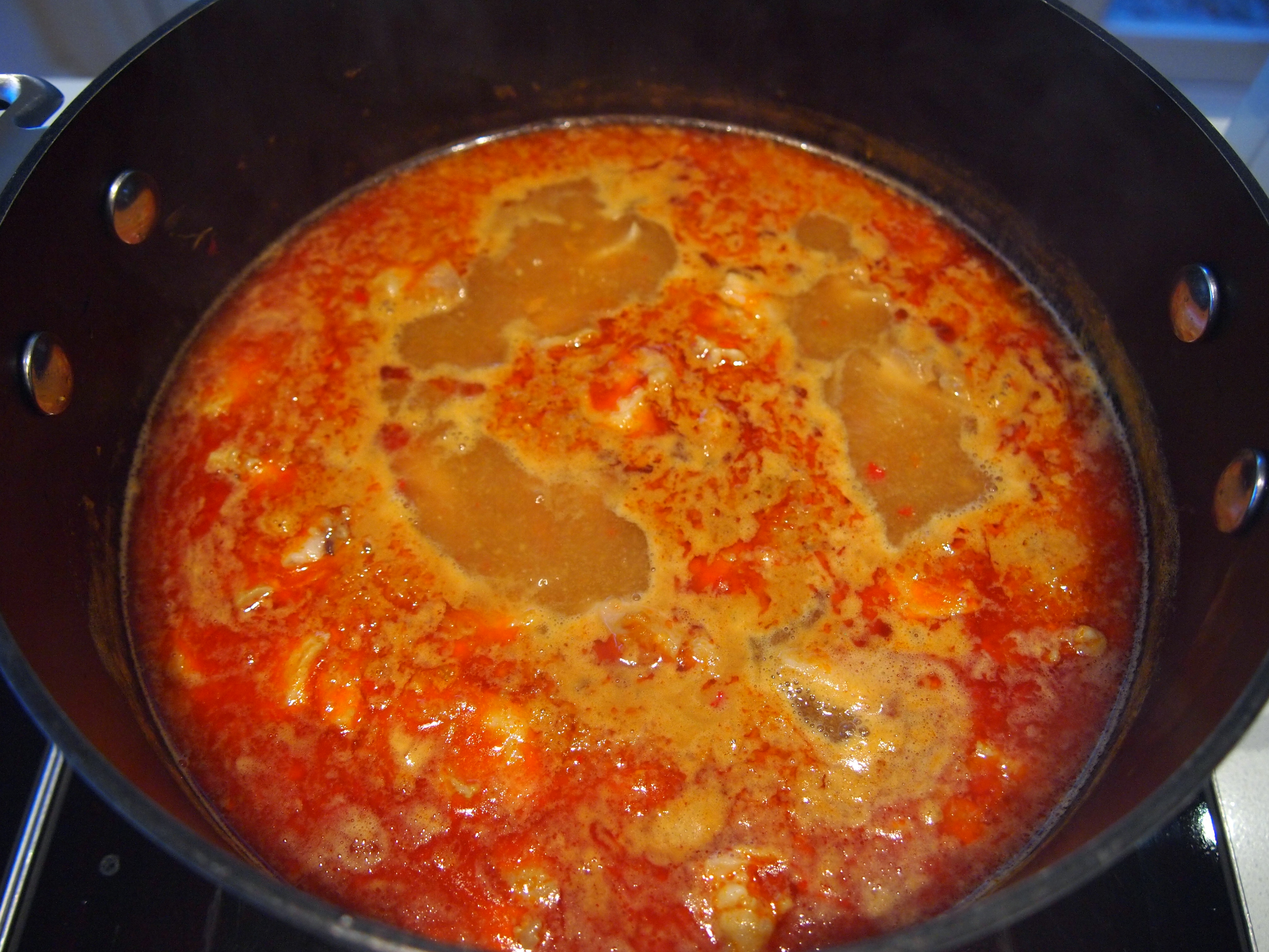 Place the shallots, garlic, ginger, chilli, dried shrimp and water in a blender or food processor and blend to a smooth paste. Shell and devein the prawns. Heat the oil in a large saucepan and fry the prawn shells and heads for a few minutes, pressing down on them with a spoon to release as much flavour as possible. Scoop out the shells and heads leaving the coloured oil. Add the blended paste to the oil and fry for 5 minutes before adding the laksa paste. Fry for a further 5 minutes, then add the chicken and stir well to coat all the pieces in the paste, and cook for another two minutes. Add the stock and bring to the boil. Lower the heat to a simmer and add the coconut milk, the fish balls, tofu (if yore using them) sugar and lime, along with fish sauce and salt to taste. Let the broth simmer for a good 15 minutes, adding the prawns in the last 5 minutes.