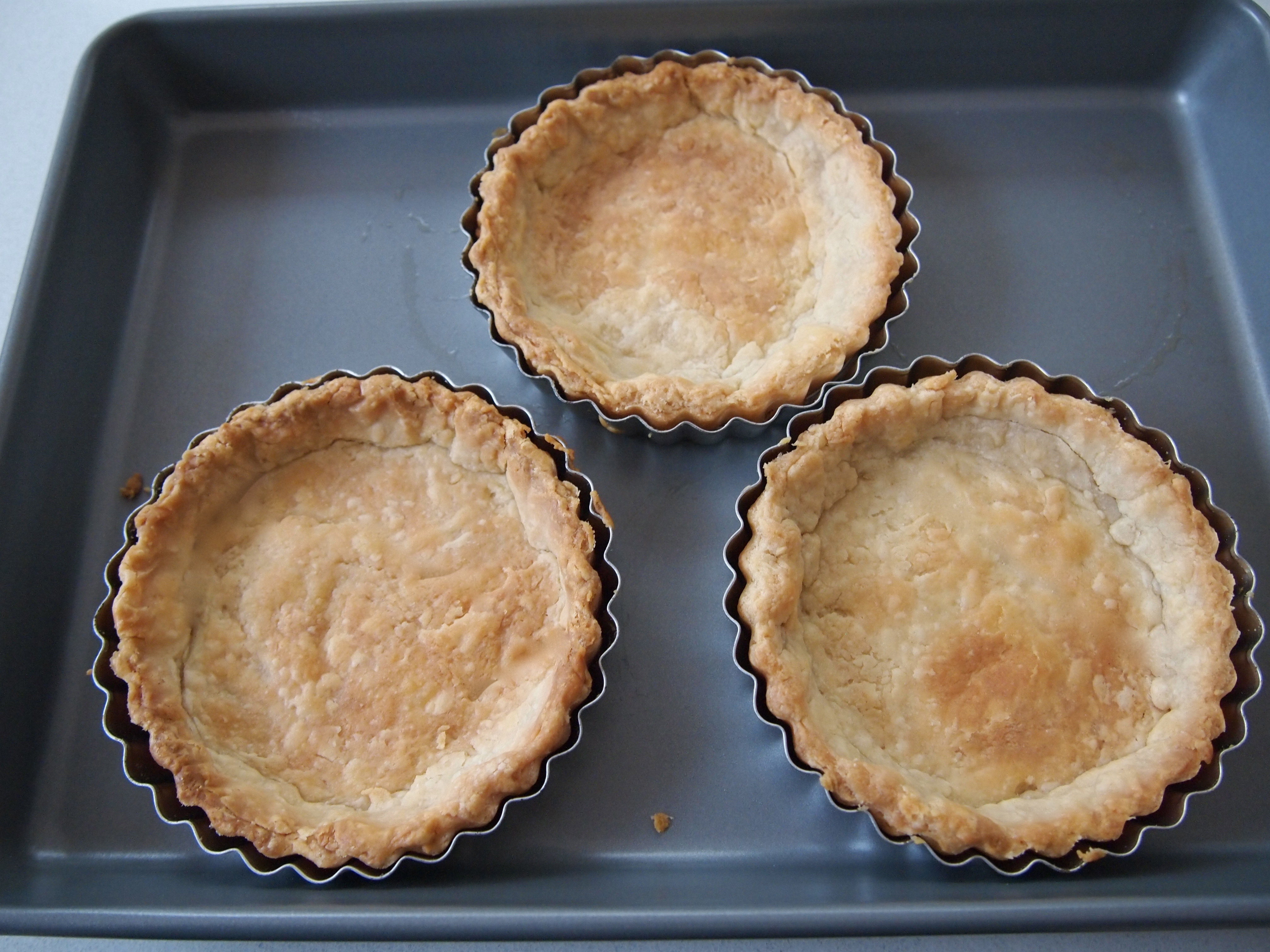 Preheat oven to 180C. Line the base of your tart tins with the pastry and refrigerate for a good half hour. Blind bake the chilled pastry by placing some baking paper into each tin and filling the cavity with rice or pastry weights. Place the tins on a  baking tray and bake for 15 minutes. Take the tins out of the oven, carefully remove the paper and weights and cook for a further 5-8 minutes. Put the shells aside to cool.