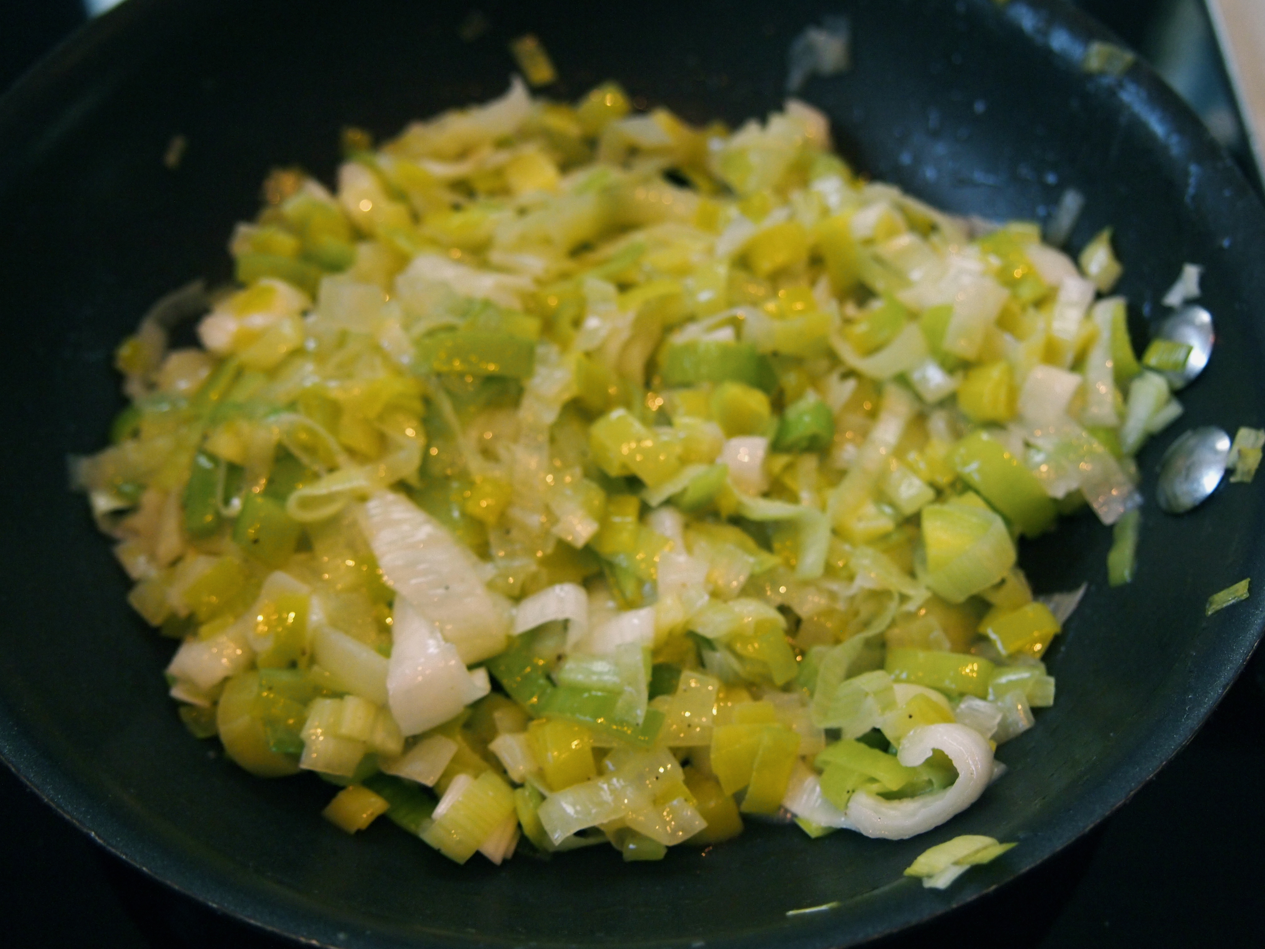 To make the filling, melt the butter in a small frypan and gently cook the leeks until just softened. Remove from the pan, draining off as much of the liquid as possible. Set aside. Place the creme fraiche, cream and egg yolks into a bowl and lightly whisk. Add the mustard, lemon juice, and herbs; mix well and season with salt and pepper.
