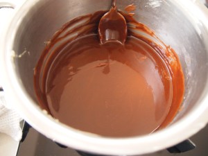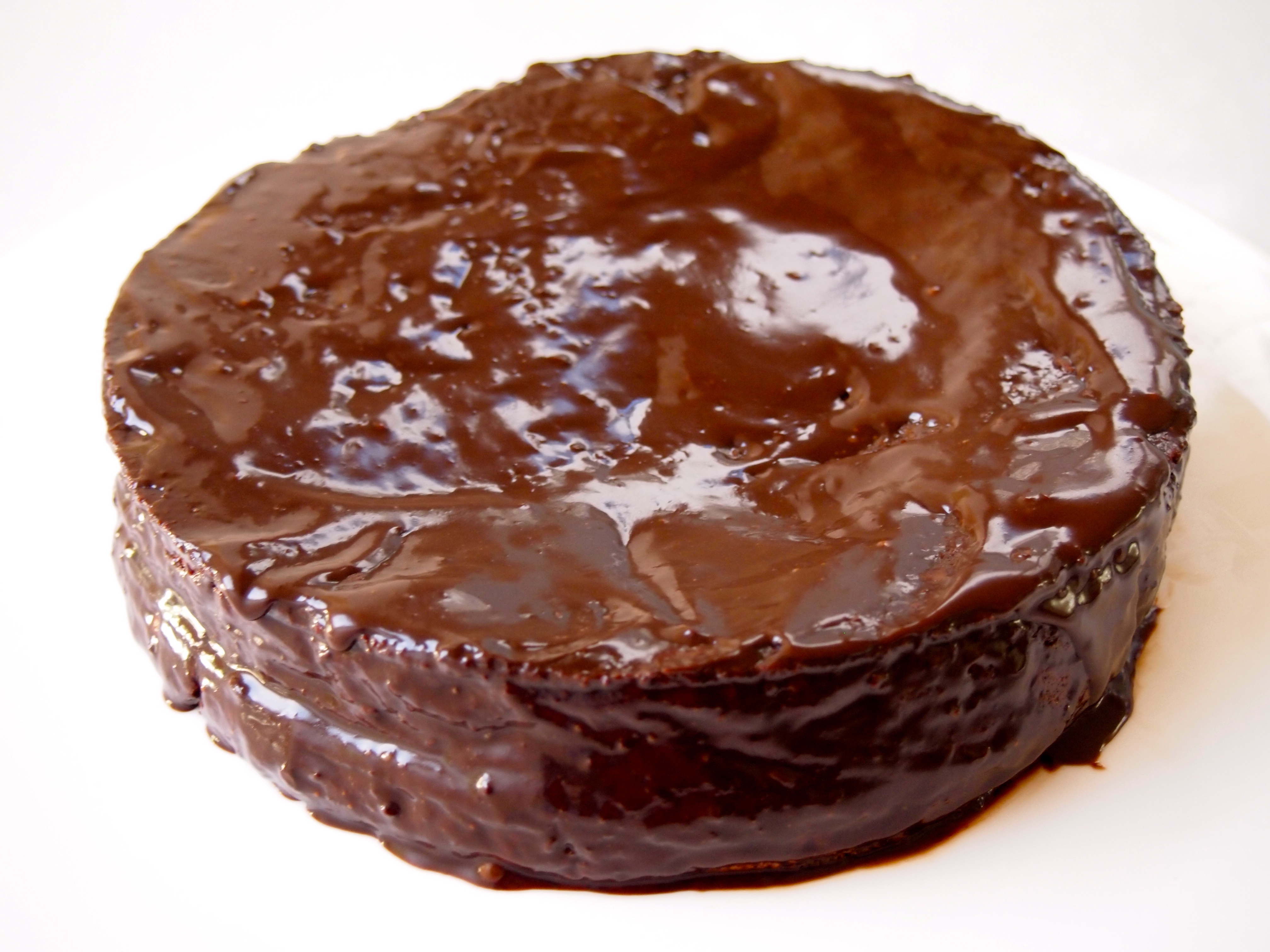 While the cake is cooling, make the icing. Melt the chocolate with the cream in a heavy–bottomed saucepan over lowest heat, stirring occasionally until the chocolate is fully melted and blended with the cream. Remove from heat and let cool slightly. When the cake is cool enough to handle, remove it from the pan and discard the baking paper. The cake is prone to sinking slightly in the middle, so flip it upside down before icing by placing a plate on top and carefully turning over the cake pan and plate together. Carefully spread the chocolate icing all over the cake with a spatula.