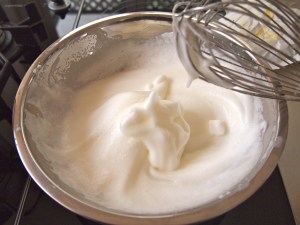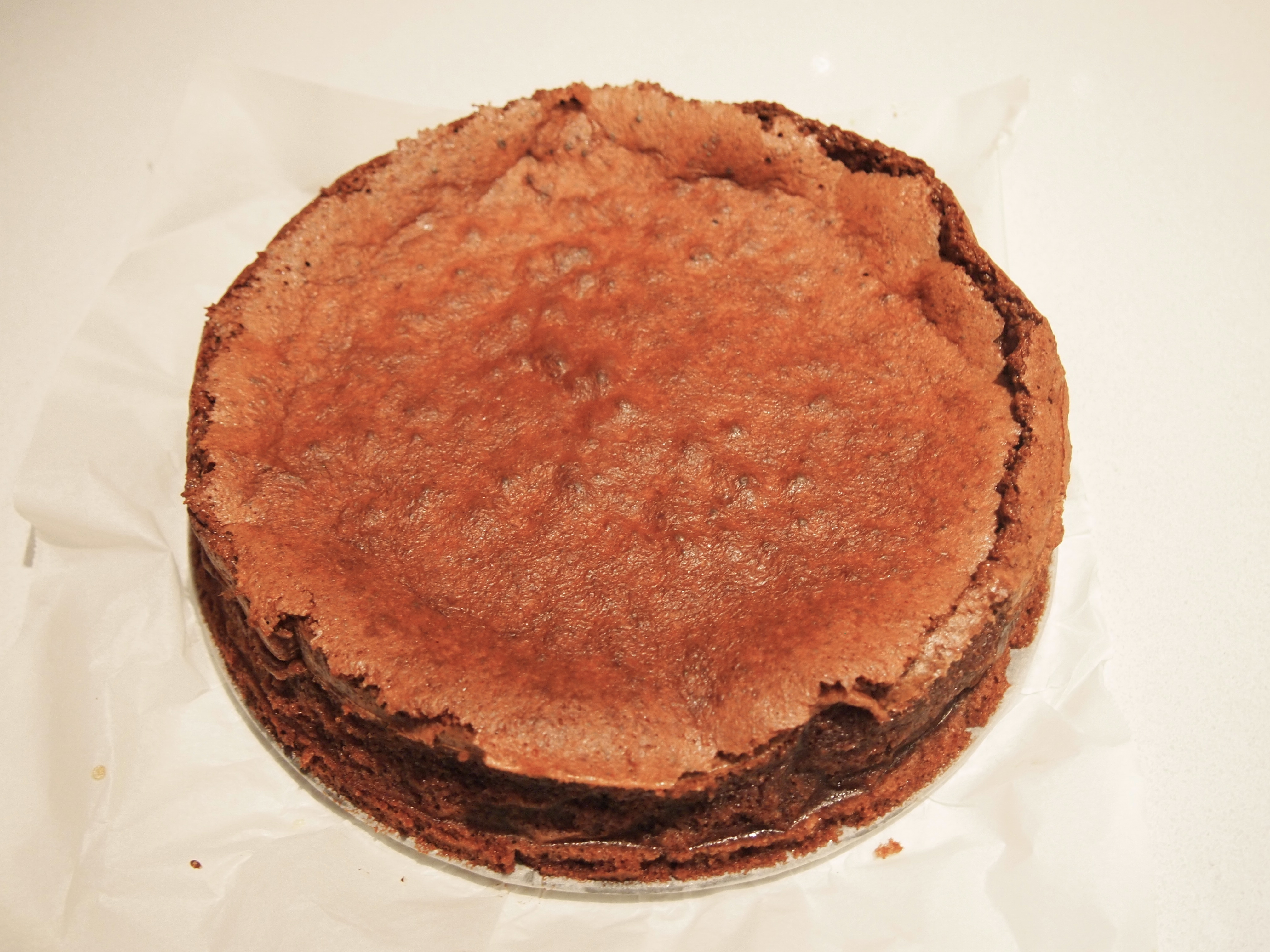 Preheat the oven to 180C. Butter a 9 inch cake pan and line the bottom and sides with baking paper. Melt the chocolate in a bowl set in a saucepan of simmering water. Mix in the butter and stir until melted. Transfer to a large bowl and add the sugar, flour, and lightly beaten egg yolks. Whisk the egg whites until stiff. Gently fold half of the whites into the chocolate mixture, blending thoroughly, then fold in the remaining whites. Pour the batter into the cake pan and bake for about 35 minutes. There will be a thin crust on top of the cake, and if tested with a toothpick the inside will appear undercooked (don’t worry, the cake will get firmer as it cools). Remove from the oven, and let cool in the pan on a wire rack.