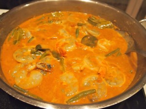 Add the snake beans and the kaffir lime leaves (crush the lime leaves in your hands before adding them to release their flavour) and the prawns. Cook for another 5-8 minutes or until the prawns are cooked through. If the sauce isn’t thick enough increase the heat so as it reduces to a nice thick consistency. Serve garnished with the finely shredded kaffir lime and coriander leaves along with steamed jasmine rice.