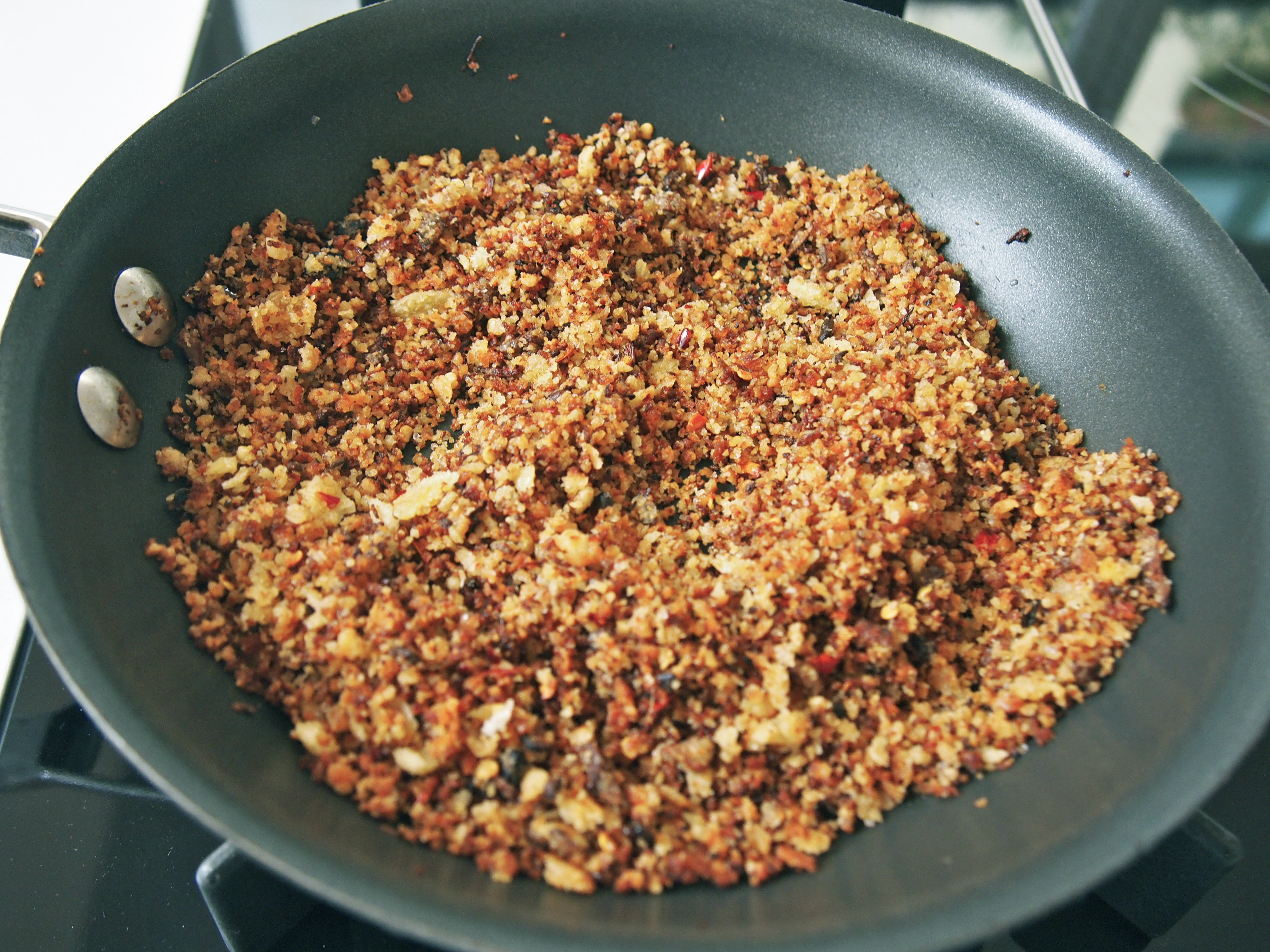 To serve place some spaghetti on each plate and from a height sprinkle generously with the pangrattato, the remaining pangrattao can be served tableside.