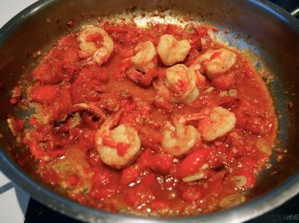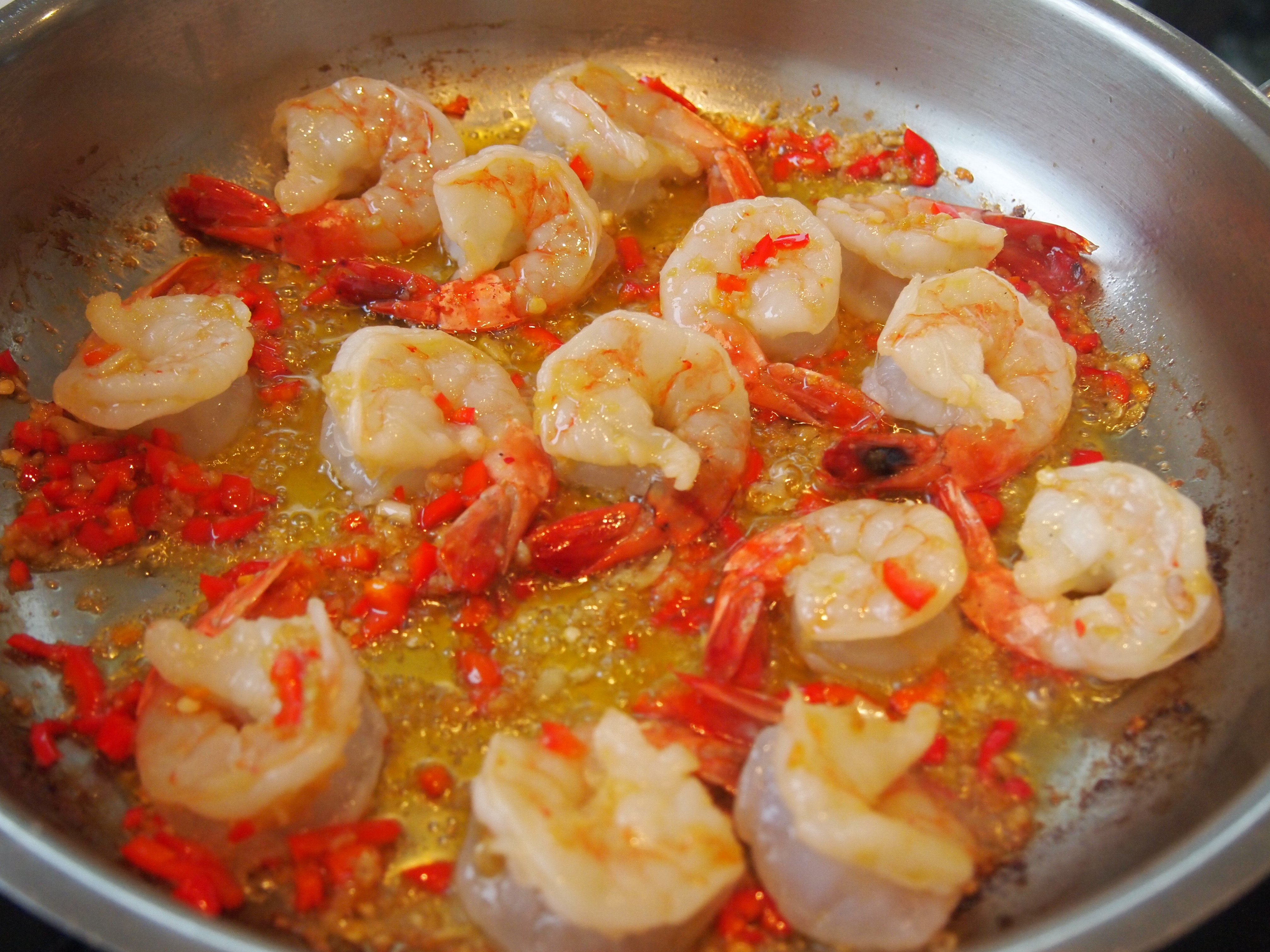 To make the sauce, place the finished peppers along with all the accumulated juices onto a large plate or platter and roughly chop them up, not too finely, and set aside. Heat a large fry pan over low-medium heat and add a generous amount of olive oil. Add the garlic and chilli and cook gently for about 4 minutes or until the garlic and chillies become soft and the oil is nicely aromatic. Make sure that your heat is gentle enough for the garlic not to burn. Add the prawns and season with some salt. Raise the heat a little and cook until the prawns have just changed colour. Add the reserved chopped peppers and stir to incorporate them with the prawns, garlic and chilli. If it looks a bit dry add a splash of water but there should be enough liquid from the peppers, this isn’t a dish with a lot of sauce – there will be just enough sauce to coat the pasta. Bring the pan to a simmer then lower the heat to the lowest setting and cover with a lid.