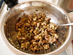 To make the stuffing, heat 1 tablespoon of olive oil in a large frypan over medium-high heat. Add the mushrooms and a pinch of salt, then cook, stirring until pale golden. Remove from the pan and allow to cool. Heat another tablespoon of oil in the pan over medium heat. Add the onion and garlic and cook, stirring, for 3 minutes or until soft. Increase heat to medium-high and add sausage meat, sage and parsley. Cook, breaking up the sausage meat with a wooden spoon for about 5 minutes or until the meat is lightly browned. Cool for 5 minutes, then add to the mushrooms with the nuts and breadcrumbs. Combine well and season.