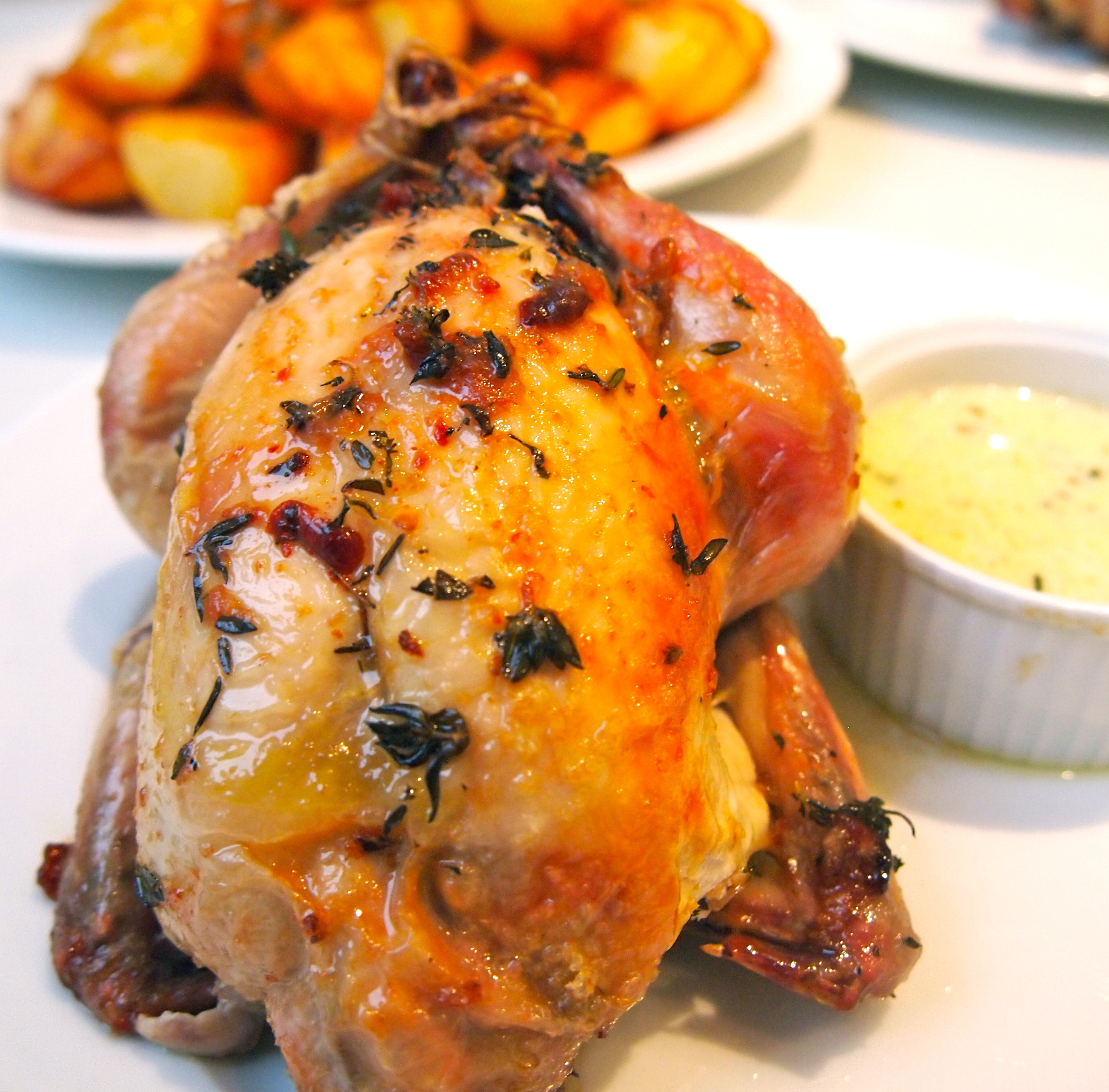 If you’re looking for an alternative to the usual roast turkey meal for Christmas then look no further. There are a lot of positives to making a meal like this for Christmas but the one that appeals to me the most is there’s no carving involved. If you’re anything like me and a somewhat clumsy carver than you’ll know that cooking a large bird is all very well and good but it’s the carving that really makes me nervous. No such worries here! A perfectly portioned, golden roasted and stuffed bird to adorn each plate, not to mention a do-ahead truffle sauce, makes this a very stress free meal. The spatcocks (or Cornish hens) can be stuffed and prepared the day before and the sauce, which takes no time at all, can be made a few hours in advance. So all you need to do on the day is bring the spatcocks to room temperature and roast them for a mere 50 minutes. A side of some roasted baby potatoes and green beans and you’ll end up with a very delicious and crowd pleasing meal. The recipe below is for two but can easily be multiplied – you can fit quite a few of these little birds on a roasting tray and they’re a lot easier to cook expertly than a very large turkey!