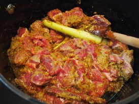 Heat the oil in a heavy-based saucepan and add the paste and the lime leaves (if you are using turmeric leaves you should add it now – see note above). Fry, stirring constantly until fragrant – about 5 minutes. Add the meat, the bruised lemongrass halves and cinnamon stick. Stir in the coconut milk, tamarind paste, 1 heaped teaspoon of salt and curry powder and mix until well combined. Add the water and toasted coconut and bring to a simmer.