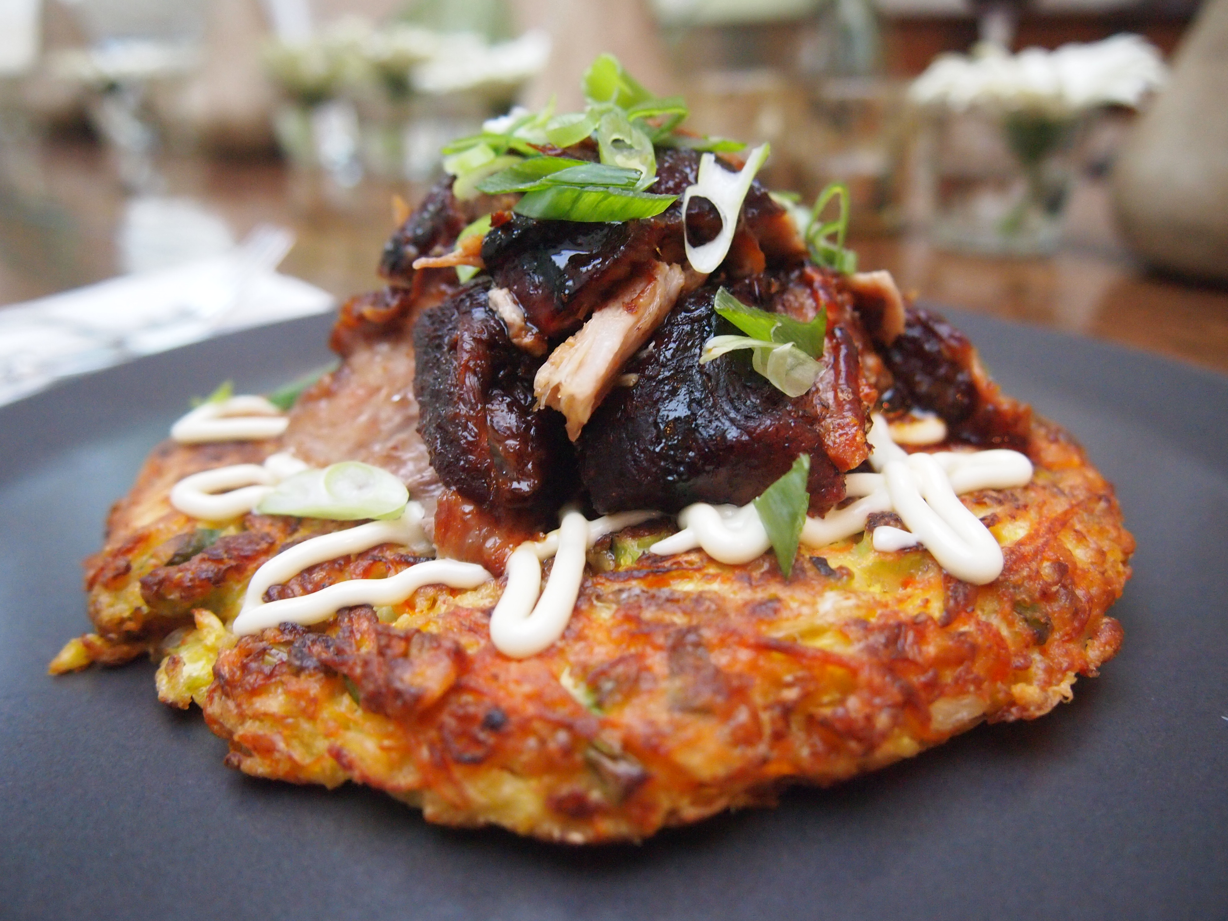 Okonomiyaki, which basically translates to “as you like it”, is a savoury fritter like pancake that’s sometimes referred to as the pizza of Japan. The similarity being the round disc shape and the fact that you can basically put anything you fancy into an okonomiyaki. The batters and toppings vary from region to region but the basic principle is the same; finely shredded cabbage and any other vegetables you like are added to a thin batter. You can include meat and seafood if you wish and a combination of dried bonito flakes, green onion, pickled ginger and tempura crumbs (I used panko bread crumbs instead) are added to boost the flavour. The mixture is then fried until golden and topped with mayonnaise and okonomiyaki sauce, which is similar in taste to barbecue sauce. This version, which is topped with slow cooked sticky pork belly with crispy crackling, takes okonomiyaki to a whole new level. This was the first time I’ve cooked okonomiyaki. I’ve ordered it many times but for some reason I didn’t think it could be easily replicated at home but I was wrong – this was just as good, and dare I say better, than many okonomiyakis I’ve had at restaurants. You don’t need to top the okonomiyaki with the pork belly if you don’t wish (but trust me it’s gorgeous with it), as the names says you can make it as you like and I’ll certainly be making these regularly. This is a fun dish to experiment with, changing the toppings and fillings to suit whatever you have on hand or are in the mood for – I find this is a great recipe to use when you have leftover bits and pieces sitting around in the fridge and vegetable drawer.