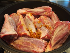 Preheat oven to 160C. Season the shanks generously with salt and pepper. Place the onions, garlic and spices into a food processor and blitz into a paste. Heat a large ovenproof pan (you’ll need one with a lid) over medium heat, add a generous splash of oil and the spice paste and fry for about 5 minutes until fragrant. Add your shanks to the spice paste with the bony ends sticking up. Blitz the tomatoes and apricots in a food processor to a thick mixture.