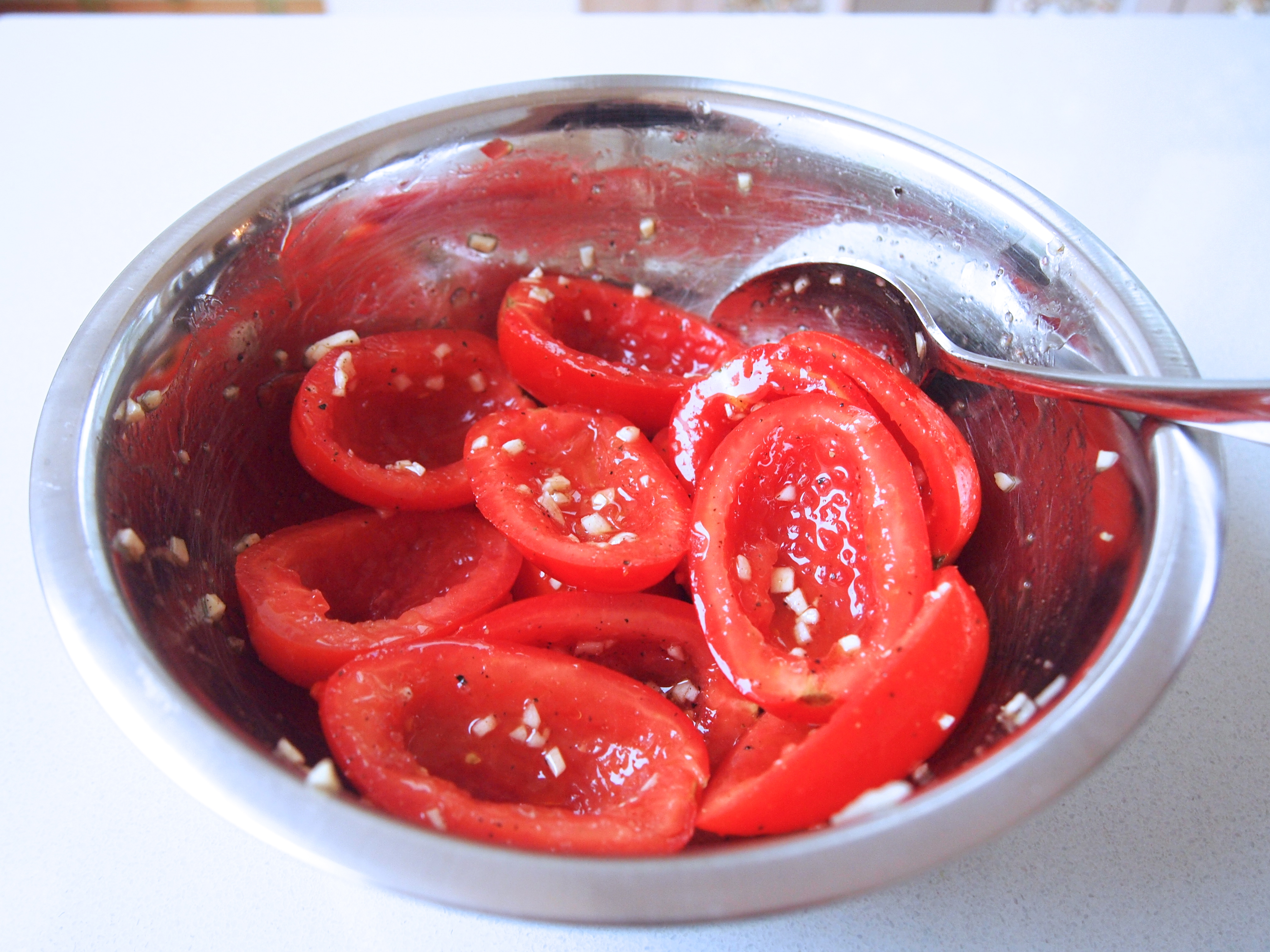 Preheat the oven to 180C. Using a teaspoon remove the seeds from the tomatoes, leaving the cavity completely empty. Place the tomato halves, cut side down, on paper towels to drain for about 5 minutes. In a large bowl, mix together the 2 tablespoons olive oil, garlic, salt, and pepper. Using clean hands, gently toss the drained tomato halves in the oil mixture until coated. Marinate the tomatoes for 10 minutes.