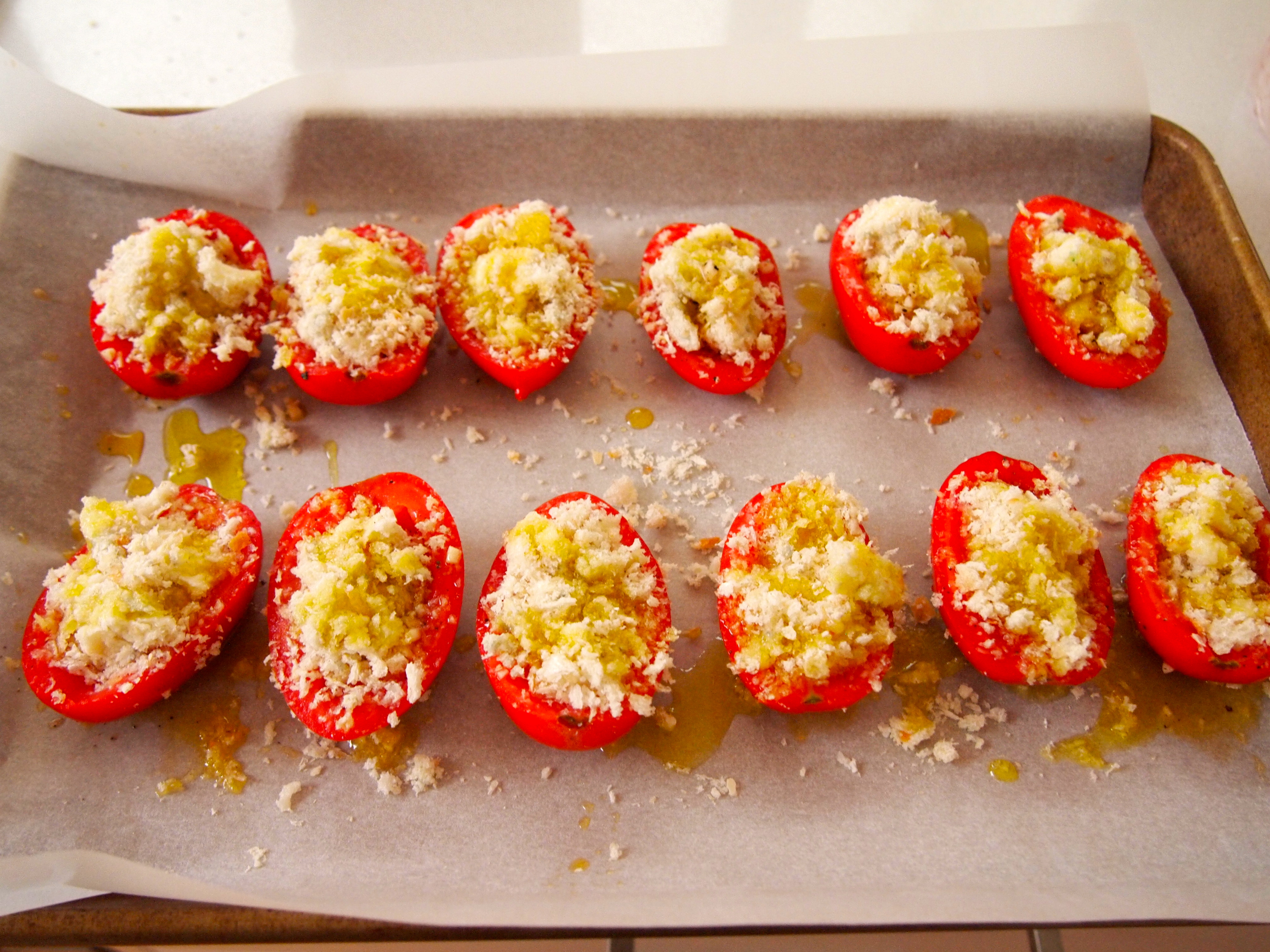 In a small bowl mix together the bread crumbs, gorgonzola, parmesan and parsley. Place the marinated tomato halves, cut side up, on a parchment lined baking sheet. Fill each tomato half with the bread crumb filling. Drizzle with olive oil and bake for 25 – 30 minutes until slightly softened and the bread crumbing topping is golden brown. Arrange the cooked tomatoes on a serving platter and serve while hot.