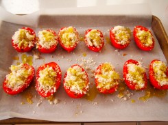 Roast Tomatoes with Garlic, Gorgonzola & HerbsIt’s been a hot summer in Sydney and even though we’re a few weeks into autumn there are still a lot of lovely tomatoes available at the markets so I’ve been making the most of them while they last. This super tasty recipe is from Giada de Laurentis and it makes a wonderful side dish to a steak dinner. In the summertime I usually make a steakhouse-style fresh tomato salad with red onions and dress it with a sauce that’s similar to steak sauce but with a bit of a vinegar kick (if you’ve ever ordered a tomato salad at a New York steakhouse you’ll know the kind of salad I mean).  But the last time we were grilling some steaks I felt like a change and these little roma tomatoes stuffed with blue cheese and breadcrumbs didn’t disappoint. Next time I’ll make extra as they would be awesome chopped up and added to warm pasta. In fact, I did have a few left over and a couple of nights later when I was making spaghetti and meatballs I added them to my meat mixture and those meatballs were some of my best yet. This is an easy and quick side dish to make and can be prepared ahead of time and baked just before serving. Giada serves these as a canapé which is a great idea, just make sure you pass out a lot of napkins as they may be a tad on the messy side for finger food.