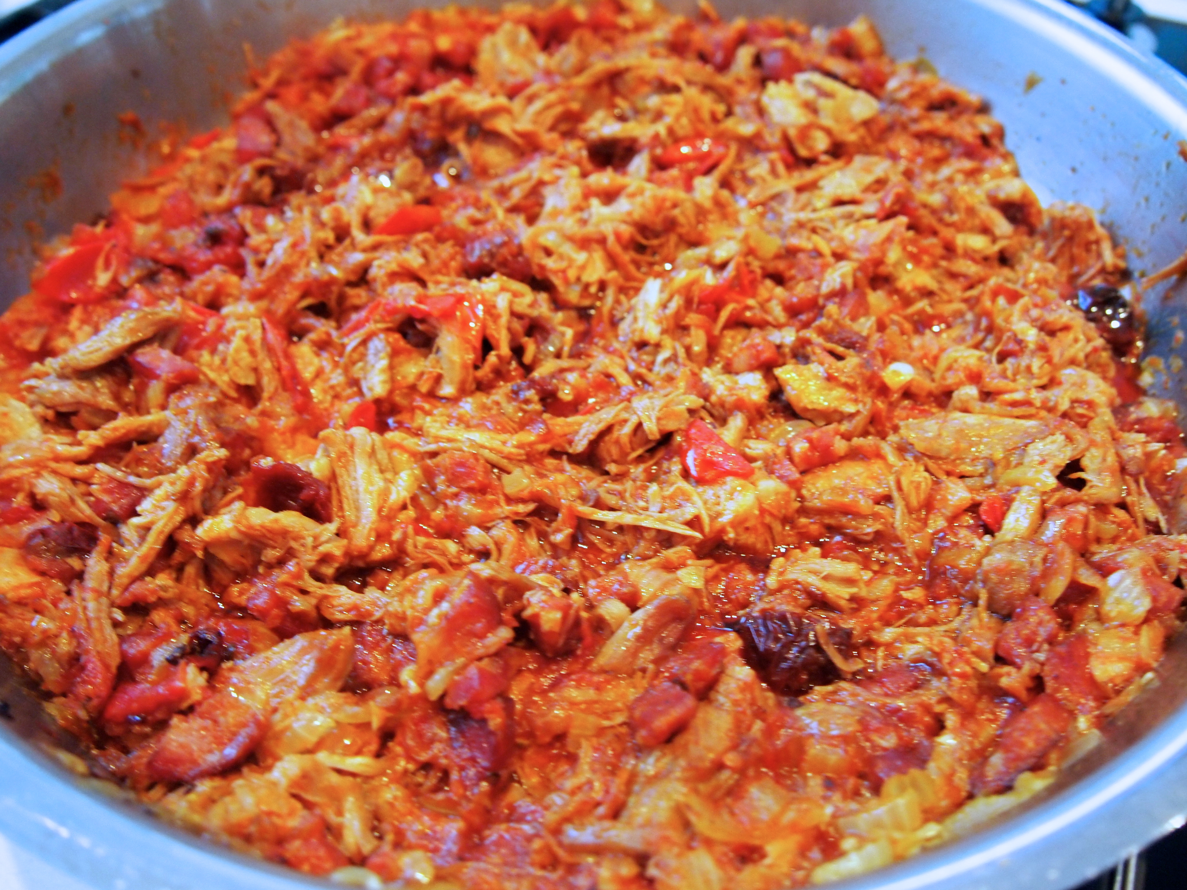 When the pork is cooked remove it to a board and shred it using a couple of forks and reserve the broth. Heat the second measure of oil in pan over medium heat, add the chorizo and cook until the oils have released and it’s starting to get crispy. Remove and set aside leaving as much of the oil in the pan as possible. Add the onion and a large pinch of salt and cook until tender, about 8 minutes. Add the garlic and cook for a further minute.