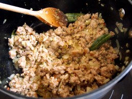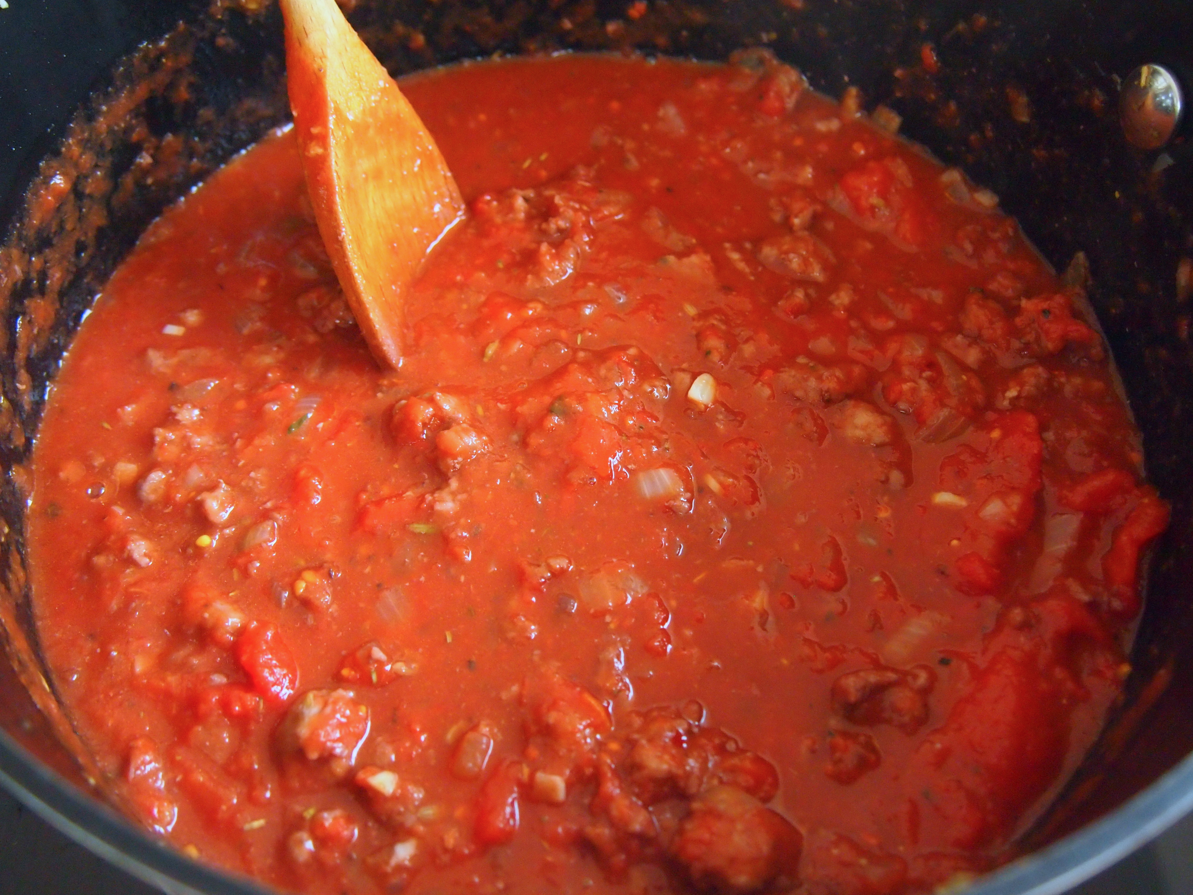 Turn the heat up to high and add the red wine and boil until it has almost all evaporated. Add the tomatoes and bring to the boil. Reduce the heat to low and simmer covered until the sauce thickens, about 30-40 minutes. Remove the bay leaves and discard.