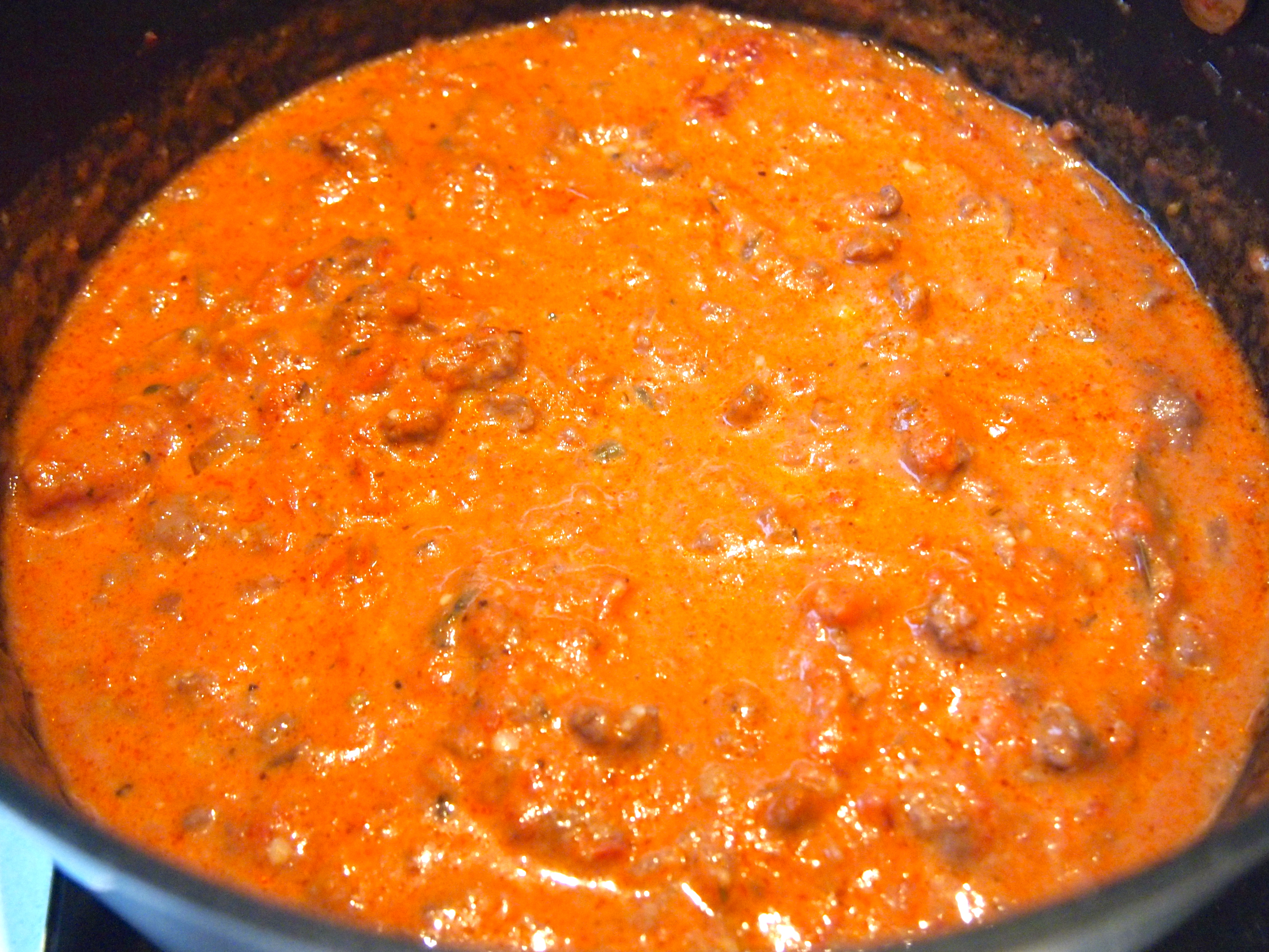 Add the cream and half the parmesan to the sauce and stir together. Season to taste with salt and pepper. In the meantime bring a large pot of well salted water to the boil. Add the pasta and cook until al dente. Drain the pasta, put it back in the pot and toss with the sauce, reserving about a quarter of it. Place on a platter or serve on individual plates topping with the reserved sauce and the remaining parmesan, serve immediately.