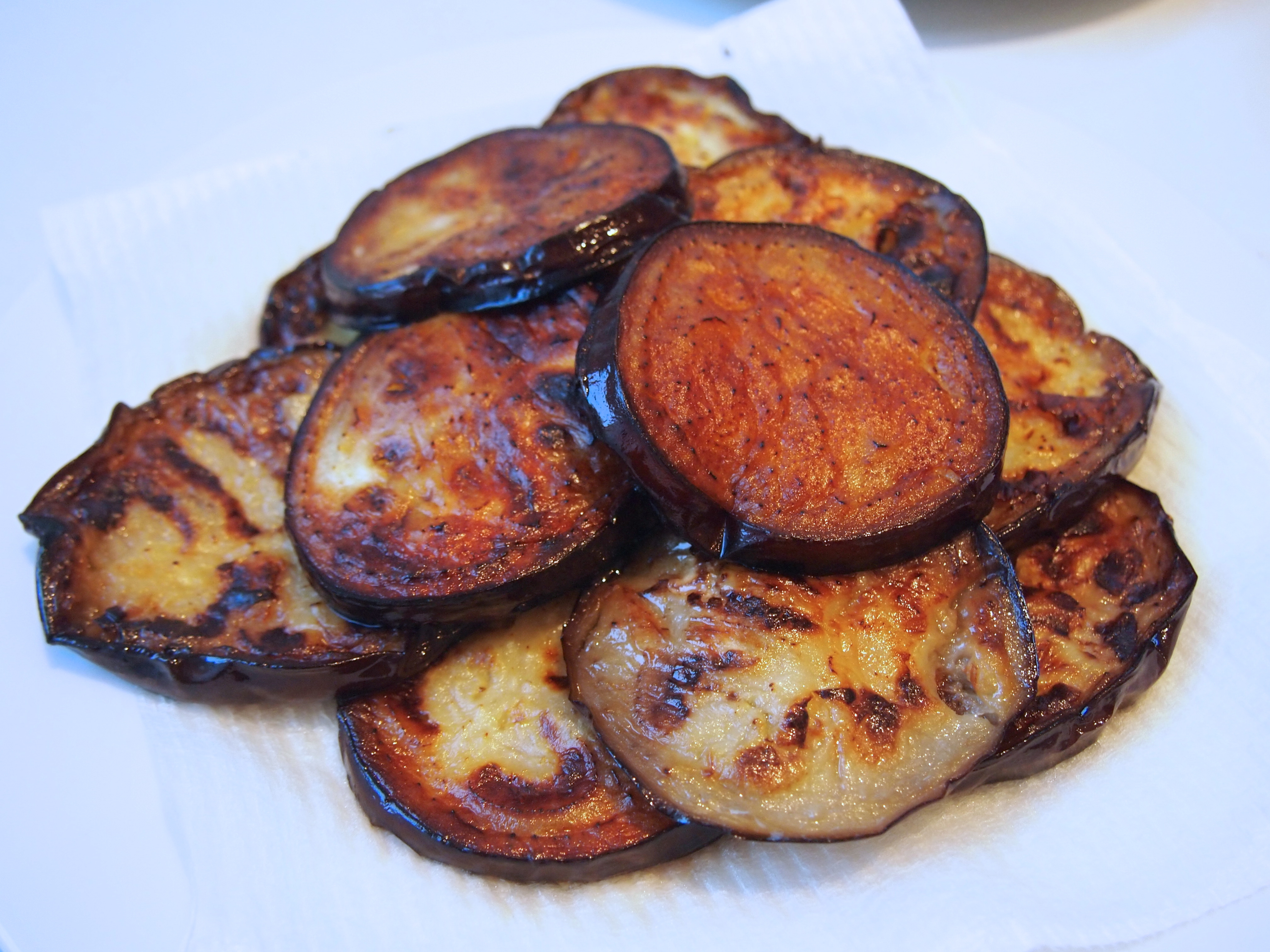 To prepare the eggplant: Slice the eggplant into 1cm rounds. I prefer to leave the skin on. Place them in a colander and sprinkle well with salt. Leave to sit for 30 minutes after which time they will have released some liquid. Pat the eggplant pieces dry with kitchen paper, wiping off as much of the excess salt as possible. Place a large non stick skillet over medium high heat and add a generous amount of olive oil – enough to cover the base of the pan well. When the oil is hot add the eggplant slices and cook until golden brown. You’ll notice that the eggplant will soak up just about all the oil in the pan but resist adding more. When the slices have become nicely brown turn them over and by this stage a little of the oil that the eggplants first soaked in will start to release back into the pan, not much, but enough to let you finish browning the other side. If you really feel that your pan is too dry add oil in small stages, just a tablespoon at a time. Remove the eggplants as they finish browning and rest on a wad of kitchen towels. Add more oil to your pan and repeat the process until all the eggplant slices are browned. It’s important that when you fry the eggplant you really achieve a nice golden colour so take your time and adjust your heat as you go.