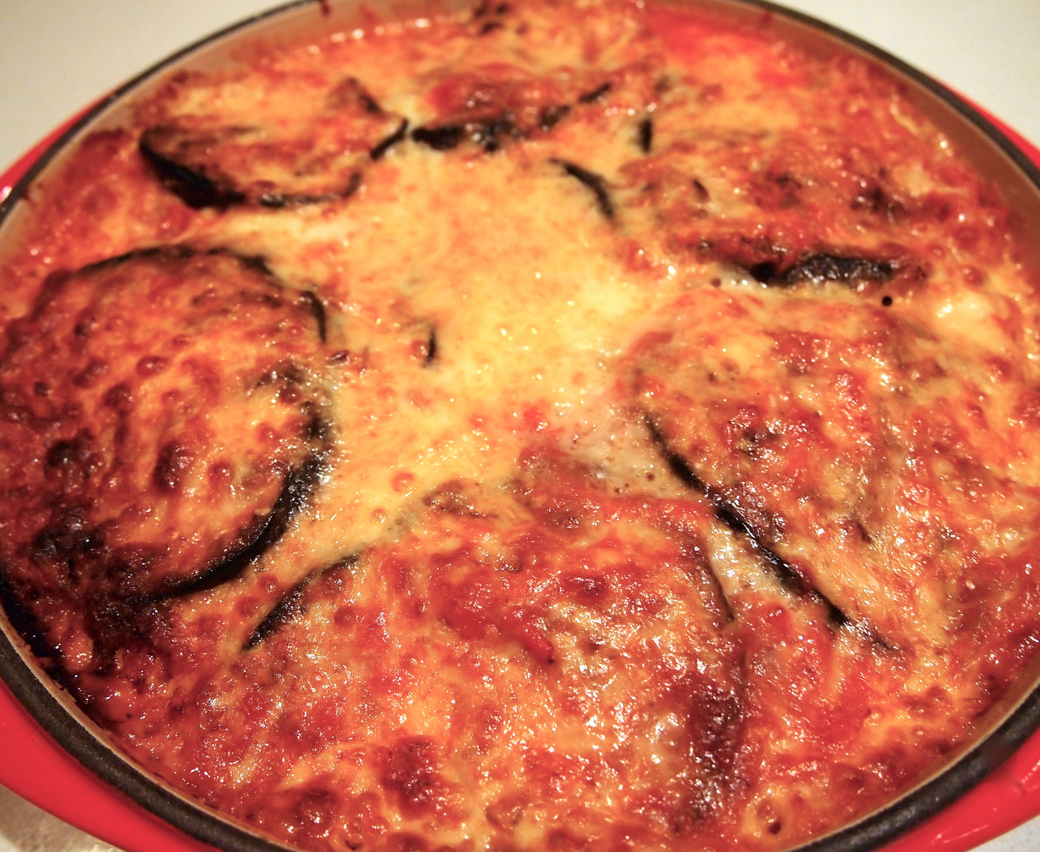 To assemble the dish: Preheat the oven to 180C. Spread a few heaped spoons of the tomato sauce on the bottom of an oven proof dish that is not too deep. I used a round 25cm cast iron dish, but any shape will do. Place three of the veal pieces over the tomato sauce and top with a handful of the grated mozzarella. Place enough of the eggplant slices to roughly cover the dish. Repeat with another layer of tomato sauce, veal and eggplant, ending with tomato sauce. Finish the dish off by sprinkling the rest of the mozzarella over the tomato sauce and topping with the grated parmesan. Then using your hands press down firmly but gently, compressing they layers. Place in the oven and cook for 30 minutes or until bubbling and golden. Let sit for 10 minutes before serving.