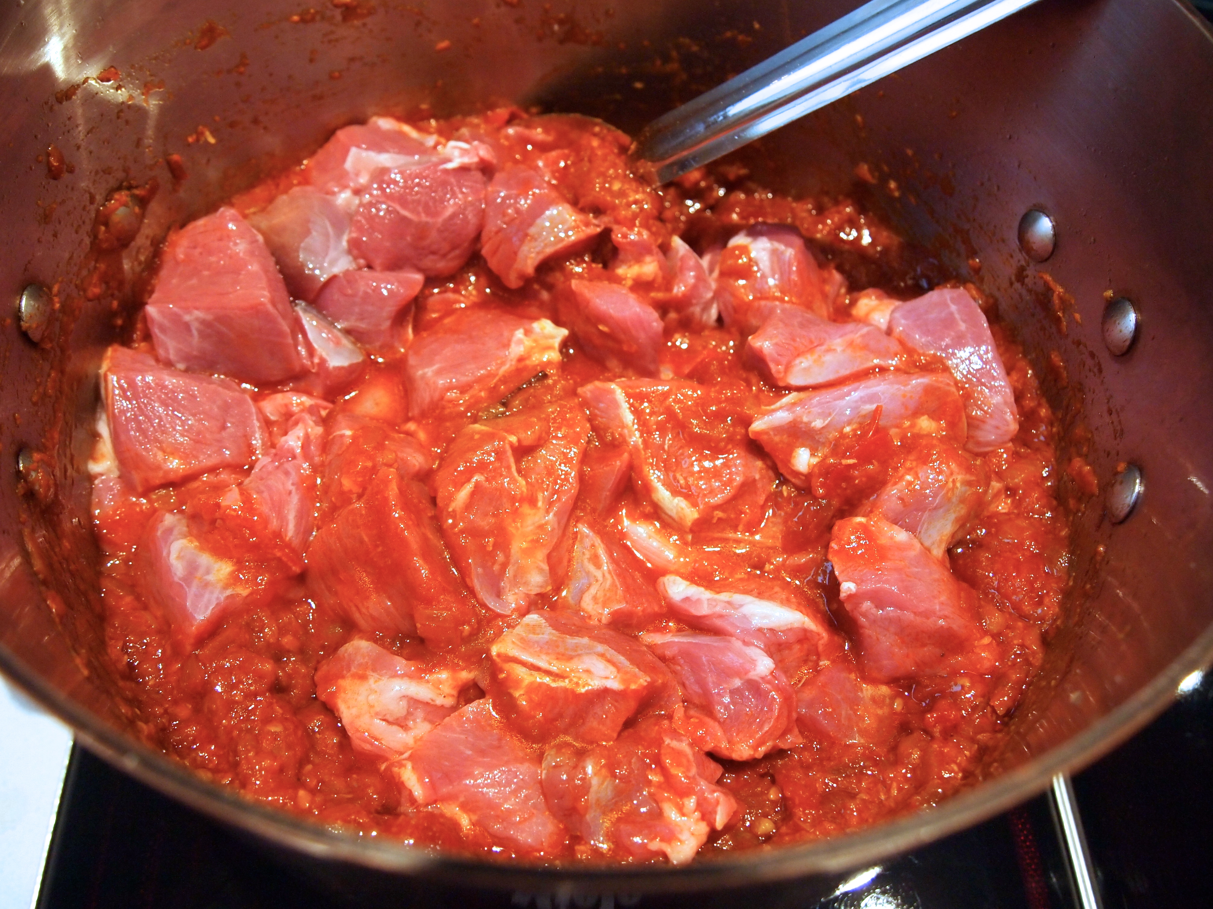 Place a large heave bottomed saucepan over medium high heat and add a generous amount of oil or ghee, at least a quarter of a cup. Add the onions along with a pinch of salt and cook, stirring often, until golden brown. There are a lot of onions so add more oil to the pan if you feel it needs it. Add cinnamon, cardamon, cloves, chillies, grated ginger and garlic and fry for a further few minutes, being careful not to burn the garlic. Lower the heat and add the fennel, turmeric, chilli powder, smoked and plain paprika, coriander, cumin and fenugreek and cook again for a further few minutes. If at anytime the pan is running too dry and the spices are sticking add a splash of water. When the spices have cooked for a few minutes add the tomato paste, chopped tomatoes and desiccated coconut and cook until the tomatoes have broken down and the curry base has been nicely caramelised. If this is done on a medium to low heat it should take a good 15 minutes and again, if the pan looks to be running dry add a little water but the juice from the tomatoes should prevent that from happening.