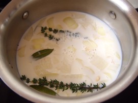 Remove the pork from the refrigerator and let it sit at room temperature for 30 minutes. Pat dry with paper towels and season with the measured salt and pepper; set aside. Place the milk, garlic, onion, thyme, and bay leaves in a large heavy-bottomed pot or Dutch oven and bring to a simmer over medium-high heat. Reduce the heat to low, add the pork, cover with a tight fitting lid, and cook for 75 minutes. Turn the pork over and continue cooking for another 75 minutes. Uncover and cook until the pork is fork-tender and easily shreds, about 30 minutes more. Transfer the pork to a cutting board.