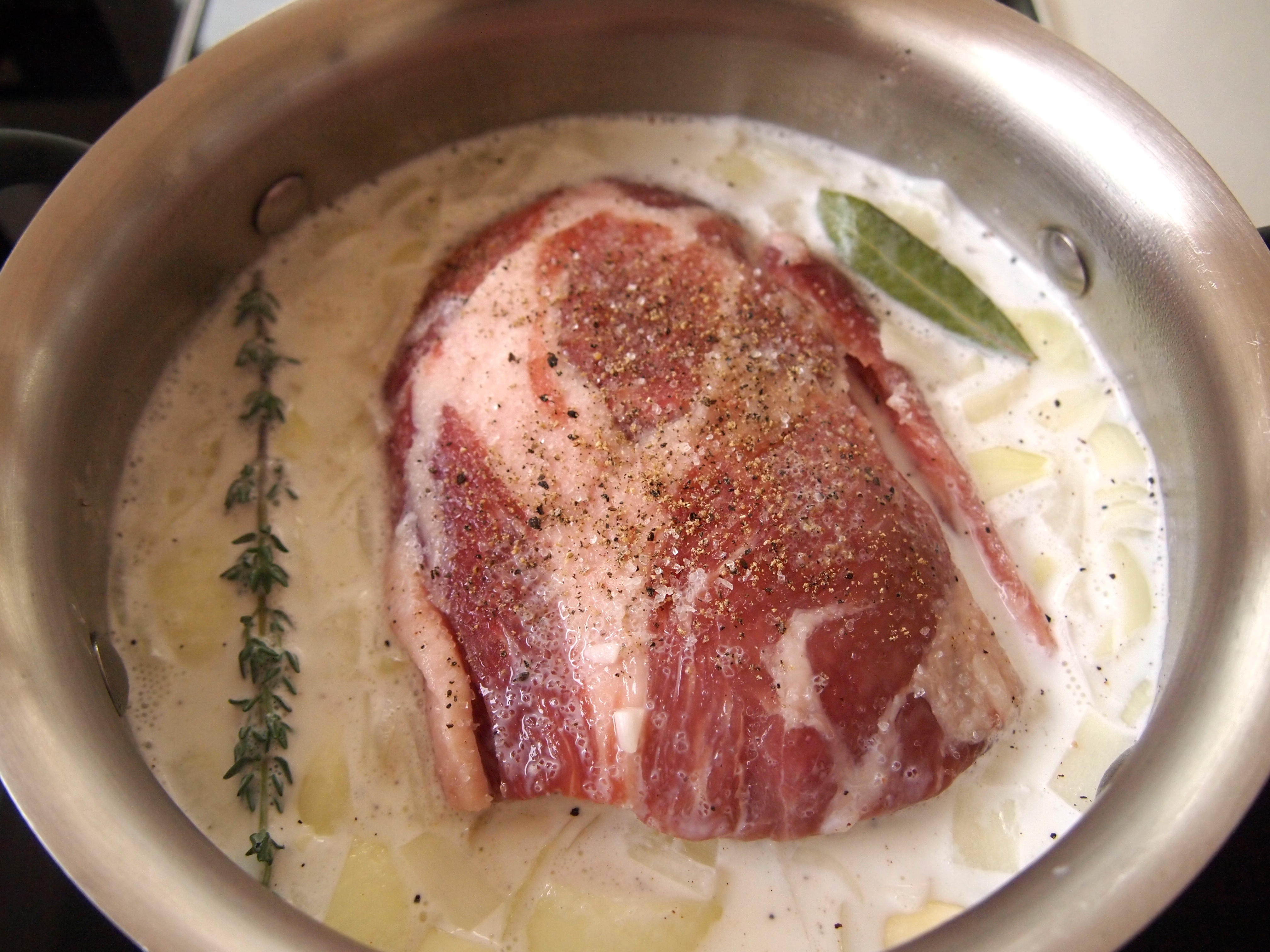 Remove the pork from the refrigerator and let it sit at room temperature for 30 minutes. Pat dry with paper towels and season with the measured salt and pepper; set aside. Place the milk, garlic, onion, thyme, and bay leaves in a large heavy-bottomed pot or Dutch oven and bring to a simmer over medium-high heat. Reduce the heat to low, add the pork, cover with a tight fitting lid, and cook for 75 minutes. Turn the pork over and continue cooking for another 75 minutes. Uncover and cook until the pork is fork-tender and easily shreds, about 30 minutes more. Transfer the pork to a cutting board.