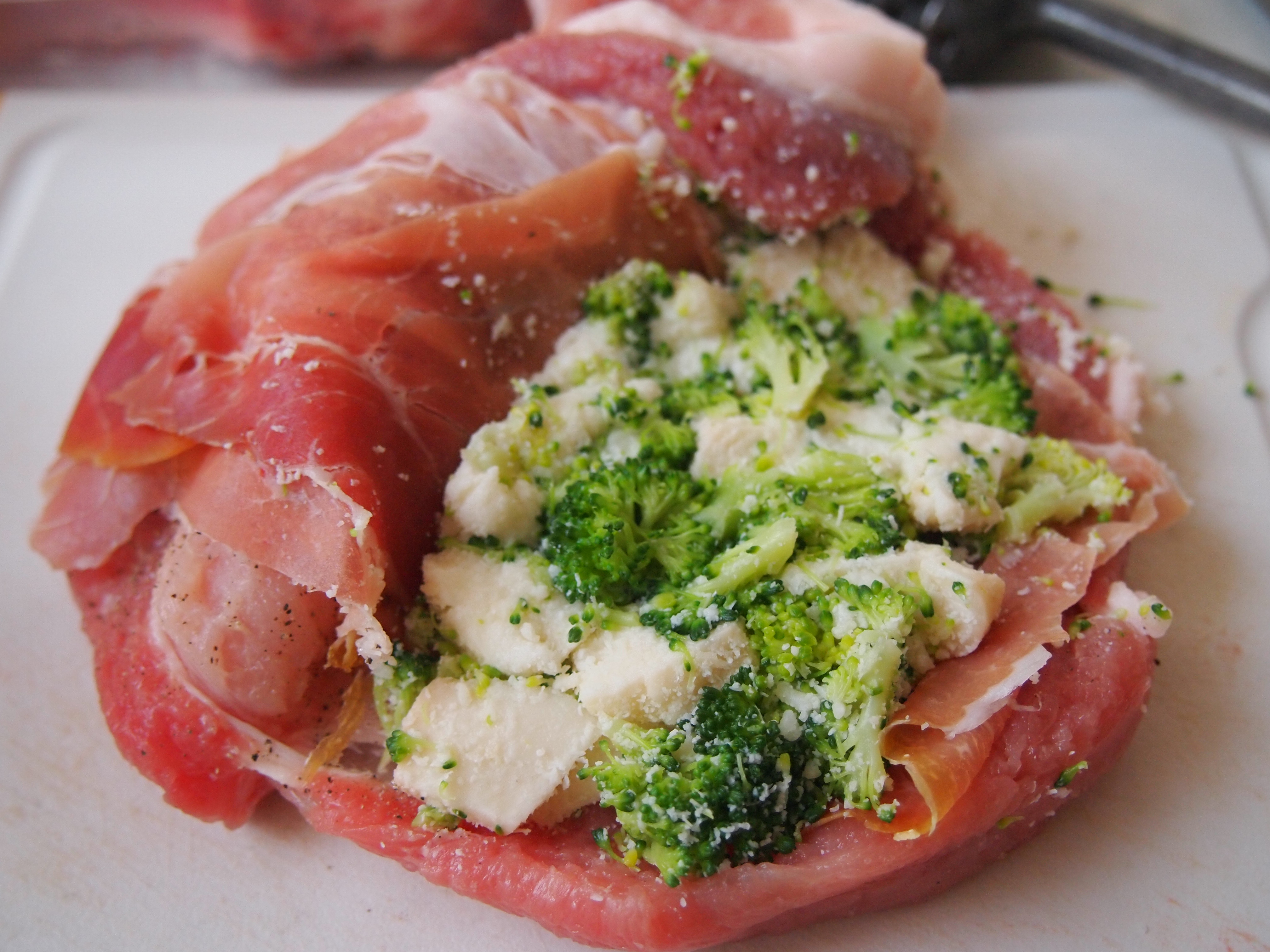 Lay a veal chop flat on a cutting board. Make a horizontal cut through the meat all the way to the bone. With the smooth side of a meat mallet gently pound each side until the veal is about half a centimetre thick. Place a slice of prosciutto over the butterflied veal chop, then place a quarter of the cheese and broccoli mixture over the prosciutto, smoothing it down to cover the veal. Fold the other side of the chop over the filling, press down the edges to seal slightly and fasten with a couple of toothpicks. Don’t worry too much about getting a perfect seal – some of the cheese will ooze out into the sauce regardless and this is what makes the tomato sauce so tasty. Press the stuffed chops gently to flatten them slightly. Repeat with the remaining chops. Season the stuffed chops with salt and pepper, then dredge them in flour to coat all sides lightly.