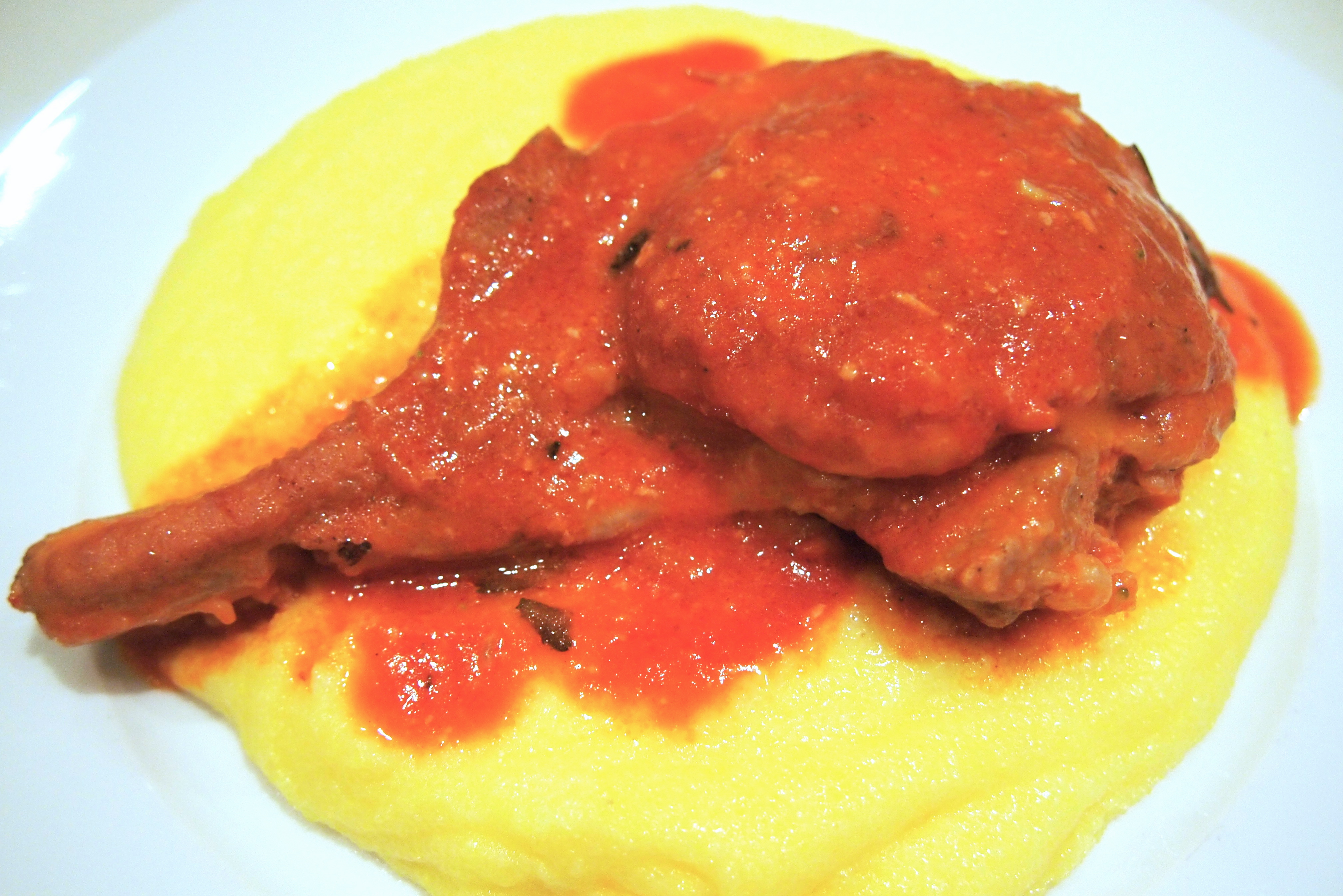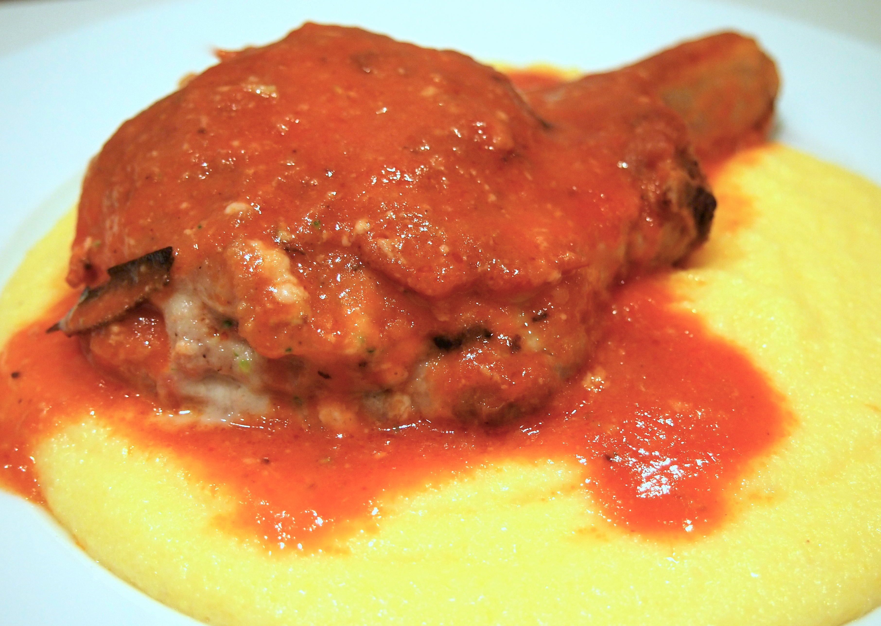 This recipe comes from Lidia Bastianich an Italian American chef who owns several restaurants in the States, has written countless cook books and made a number of television shows – she’s sort of the Barefoot Contessa of Italian food. I find her recipes to be very approachable and totally authentic, despite her many years living in the States Lidia’s recipes have stayed true to their Italian roots. I’ve made this dish on numerous occasions and I’m always blown away by it’s amazing flavour. Every mouthful packs a punch, from the tender veal to the cheesy goodness of the taleggio stuffing which seeps into the tomato sauce making it rich and creamy. This dish is deceptive in appearance, it may look like a simple veal chop braised in tomato sauce but once you start eating it you realise you’ve been duped and that this is veal chops and tomato sauce like you’ve never had before. I teamed the veal with soft polenta but you could also serve it with mashed potatoes or even pasta. If you can’t find good sized veal chops you can substitute with free range pork chops instead which are sometimes easier to find than veal chops.