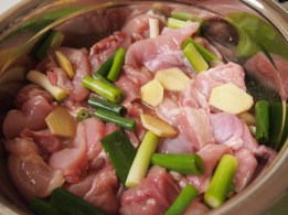 In a bowl, combine chicken, rice wine, salt, spring onions, and ginger. Leave to marinate at room temperature for 30 minutes, stirring occasionally. Drain, reserving chicken, spring onions, and ginger.