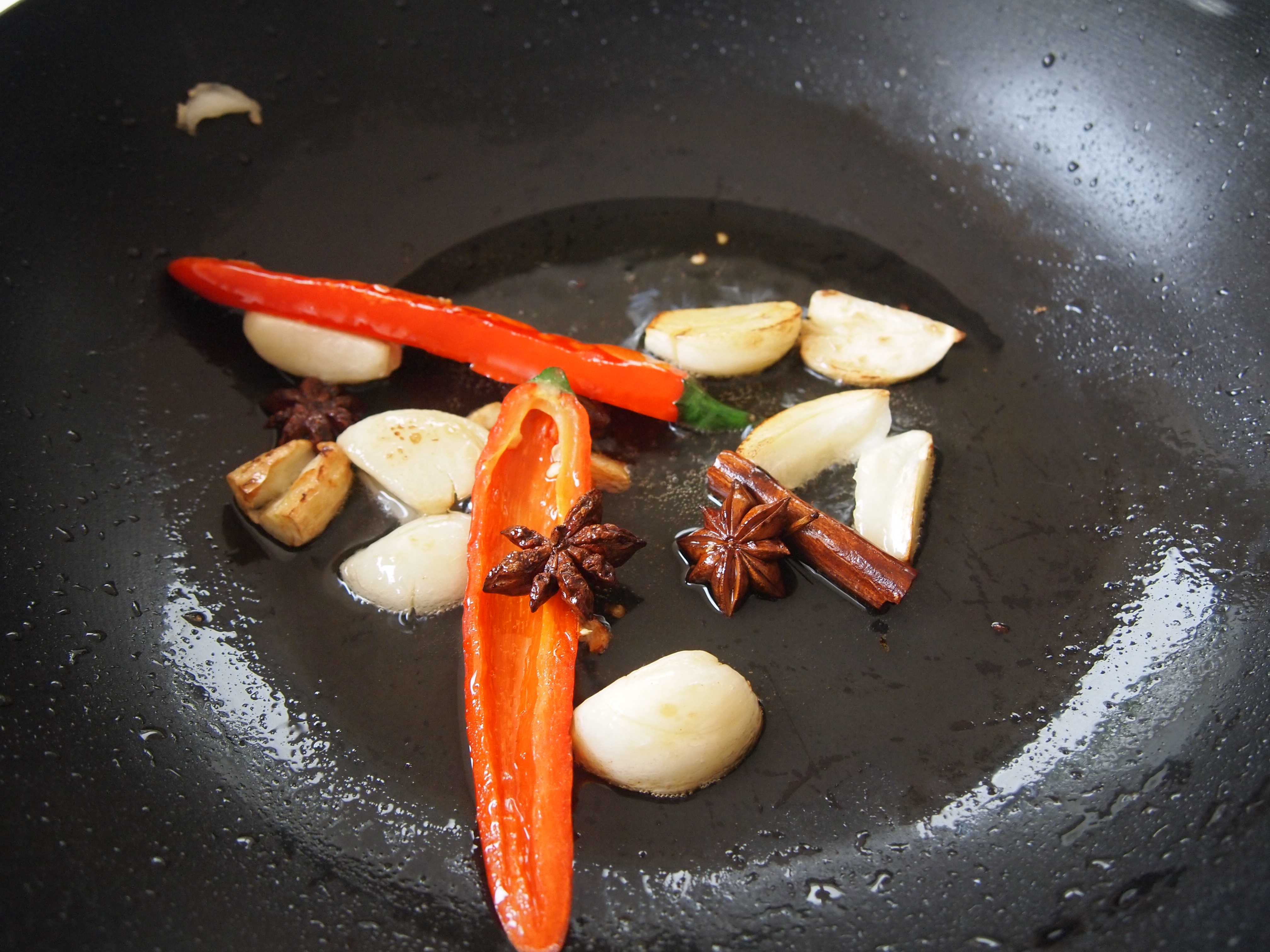 Heat a wok or a deep sided fry pan over high heat. Swirl in the oil and add garlic, star anise, chillies, cinnamon, and tangerine peel and cook for 1 minute. Add reserved chicken, spring onions, and ginger and cook until lightly golden, about 10 minutes. Add soy sauces and cook for another couple of minutes. Add 1½ cups water and bring to the boil, then lower the heat and simmer covered for 30 minutes. Add sugar and shiitake mushrooms, stir well and cook uncovered for a further 15 minutes, by which time the chicken will be cooked through and tender.