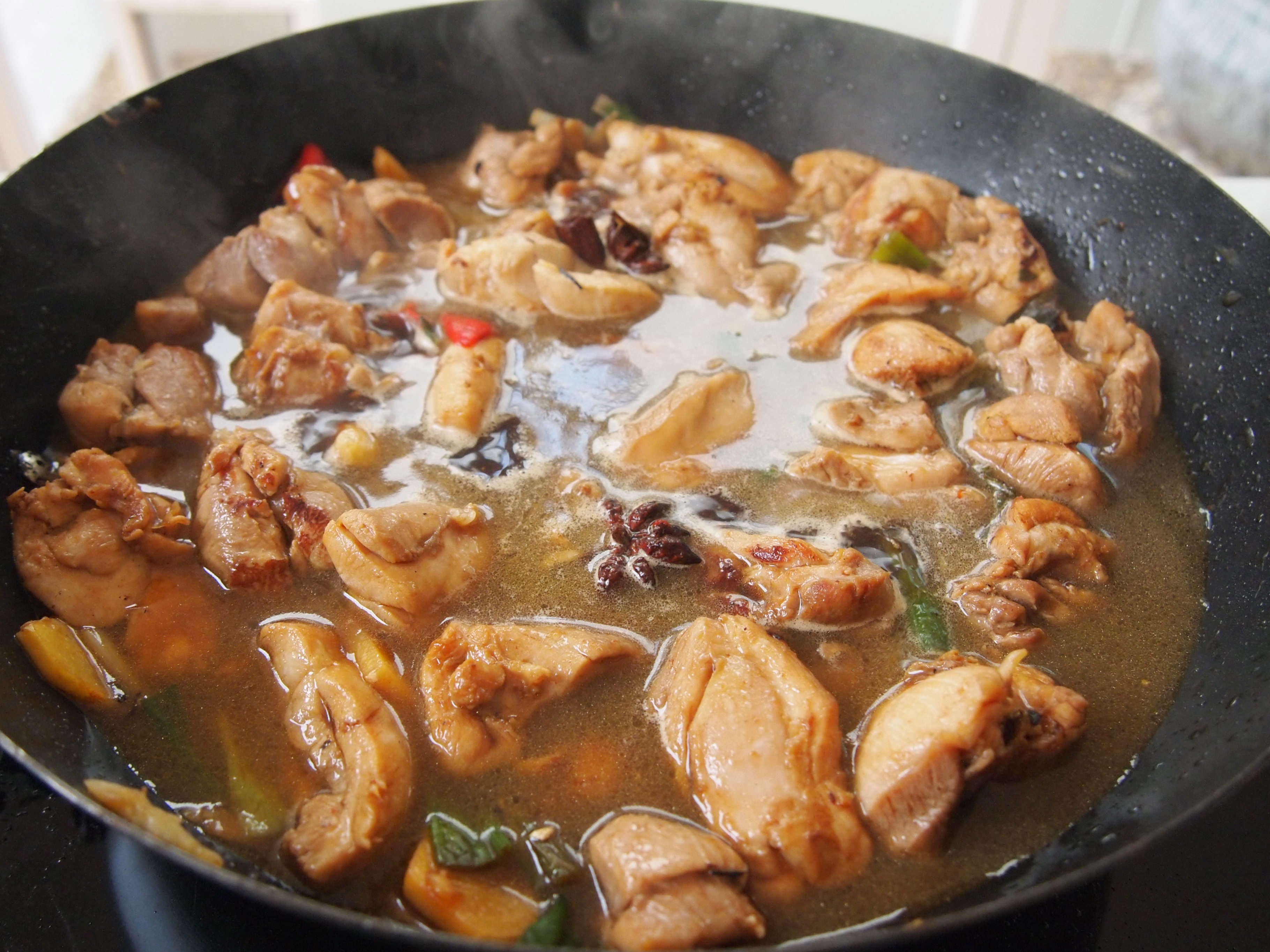 Chinese Red Cooked ChickenRed Cooking in Chinese cuisine, Hong Shao, refers to food  (normally pork, chicken or duck) that has been braised in a mixture of soy sauce, Chinese rice wine and whole spices. The soy sauce and long braising imparting the meat with a lovely mahogany hue. It’s a wonderful warming and comforting dish that’s great for colder weather. I like to use thigh fillets for this recipe but you can also use whole chicken thighs or thigh cutlets with the bone in. You can leave the skin on or off, my preference is for the chicken to be skinless – if you can’t have crisp skin I don’t see the point and braising in liquid means the skin goes limp so might as well save the calories. One important ingredient in this dish is the rock sugar which is available at most Asian grocers. You could replace it with normal sugar which will give you the necessary sweetness but it won’t impart the same glossy finish to the sauce. If you’re doing an Asian themed dinner and want to serve a few main courses this would be an ideal dish to include on the menu as it can be prepared in advance and re-heated just before serving. I accompanied the  chicken with Szechuan green beans with spicy mince and lots of steamed rice to mop up the delicious braising liquid.