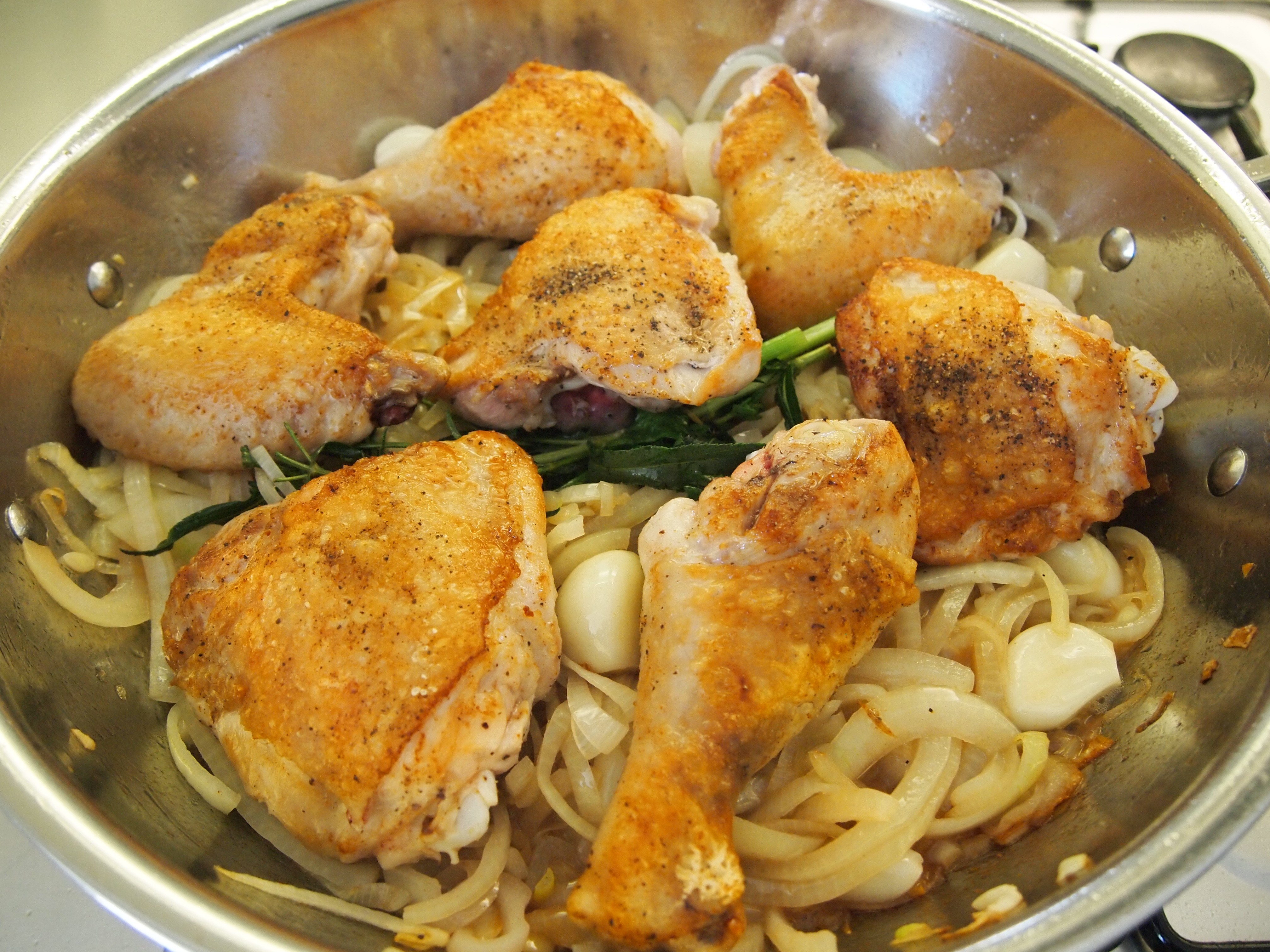 Generously season chicken with salt and pepper. In a large shallow sided pan, combine oil and butter over high heat. When hot, and working in batches, add the chicken skin side down and cook until golden brown on one side. This will take about 5-7 minutes at least and the best way to achieve great colour is to leave the chicken alone and not move it around at all. Once the skin side is golden turn the chicken pieces over and brown a further five minutes on the other side. Keep the heat regulated so the skin doesn’t scorch. When all the chicken is browned, remove to platter.