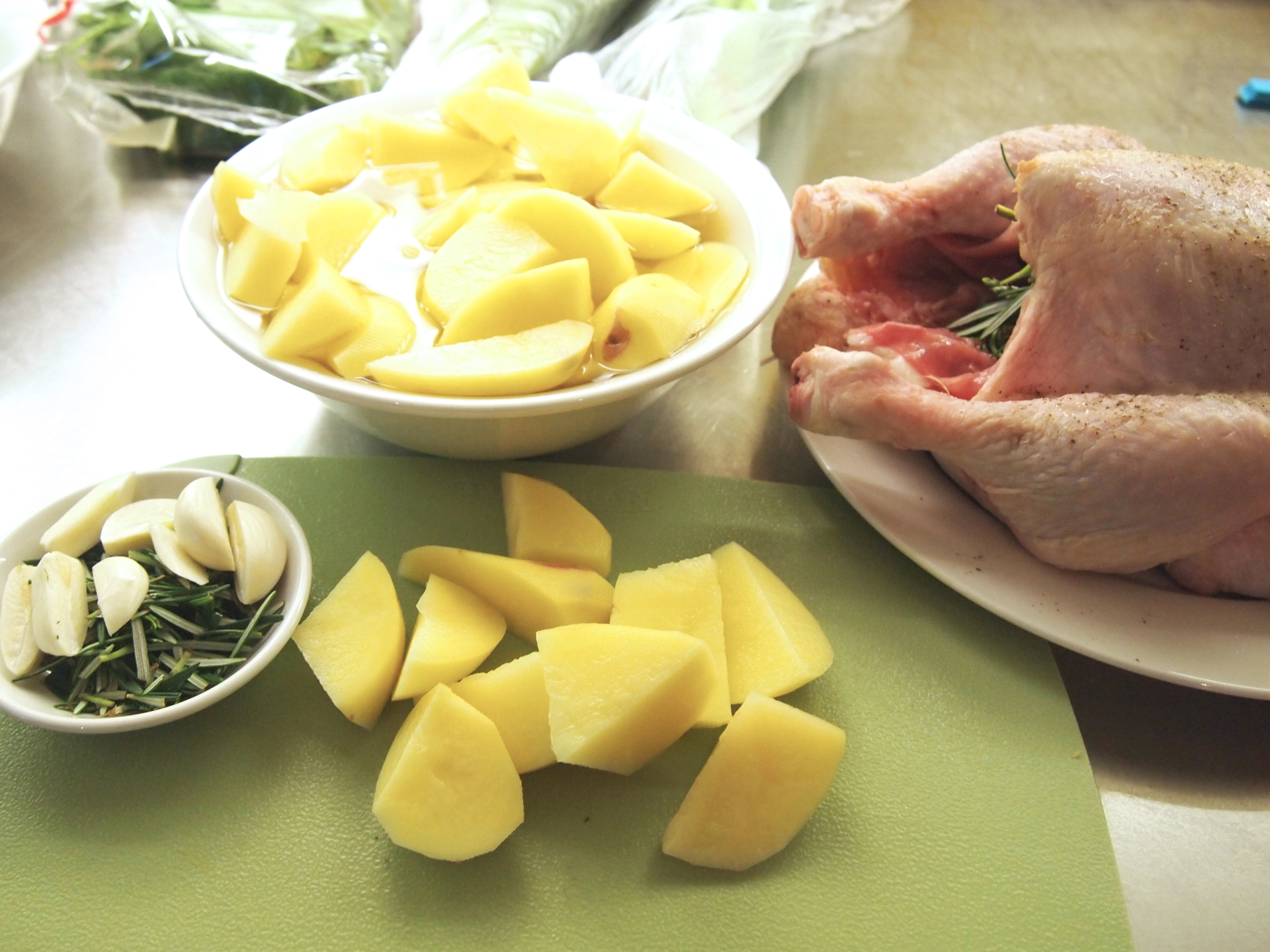 Carve the chicken and serve with the potatoes and some steamed greens or salad.