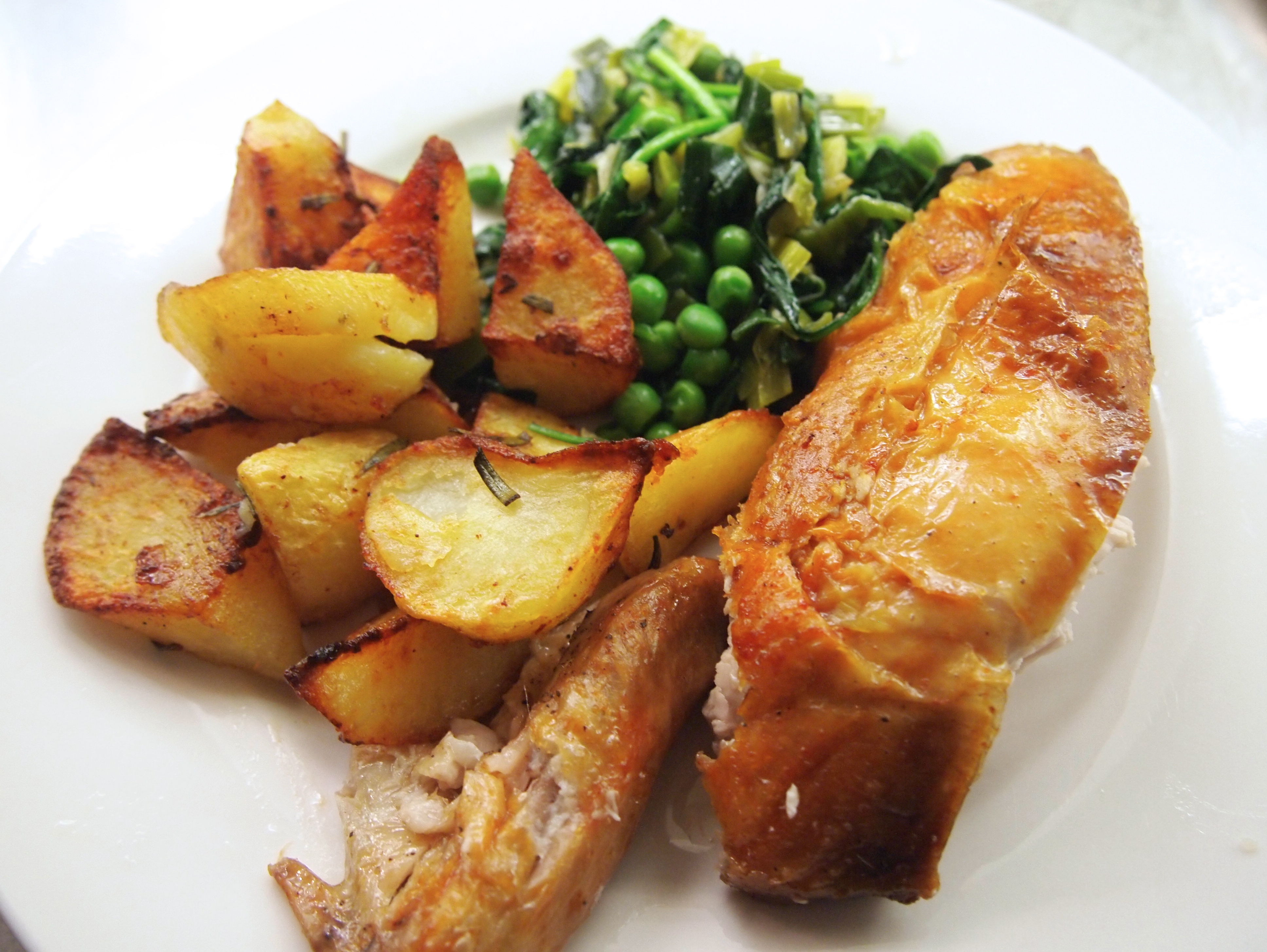 Just before the 30 minutes is over, drain the potatoes and dry them throughly with kitchen paper. At the 30 minute mark remove the roasting tray from the oven and take out the chicken, tilting the chicken slightly so the juices in the cavity drip back into the pan. Add the potatoes to the roasting tray along with the remaining chopped rosemary and garlic. Season the potatoes with salt and add a small drizzle of olive oil. Toss the potatoes in the pan ensuring they are well coated with the pan juices and oil. Shove the potatoes to the sides of the tray and return the chicken to the centre. Place the roasting tray back in the oven and cook for a further 30 – 40 minutes or until the chicken is golden and cooked through. Halfway through the cooking time give the potatoes a little toss around. When the chicken is done remove it from the pan and set it aside to rest, again tipping the juices in the cavity back into the pan. Give the potatoes another good toss and spread them out in the tray. Return to the oven and continue to roast while the chicken rests. I found that another 15 minutes was enough for the potatoes to be lovely and crisp but you can cook them for longer as the chicken can safely rest for up to 30 minutes.