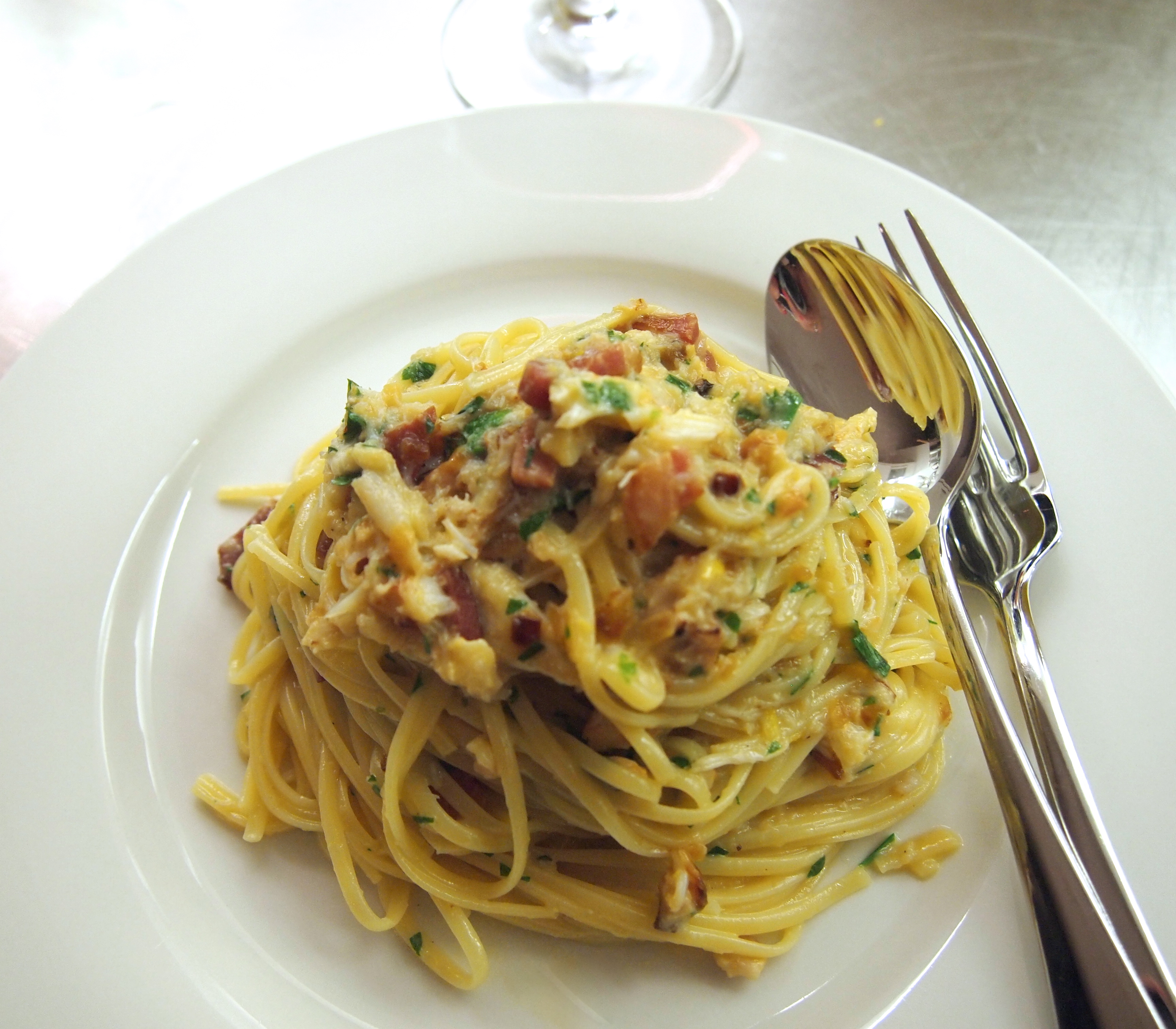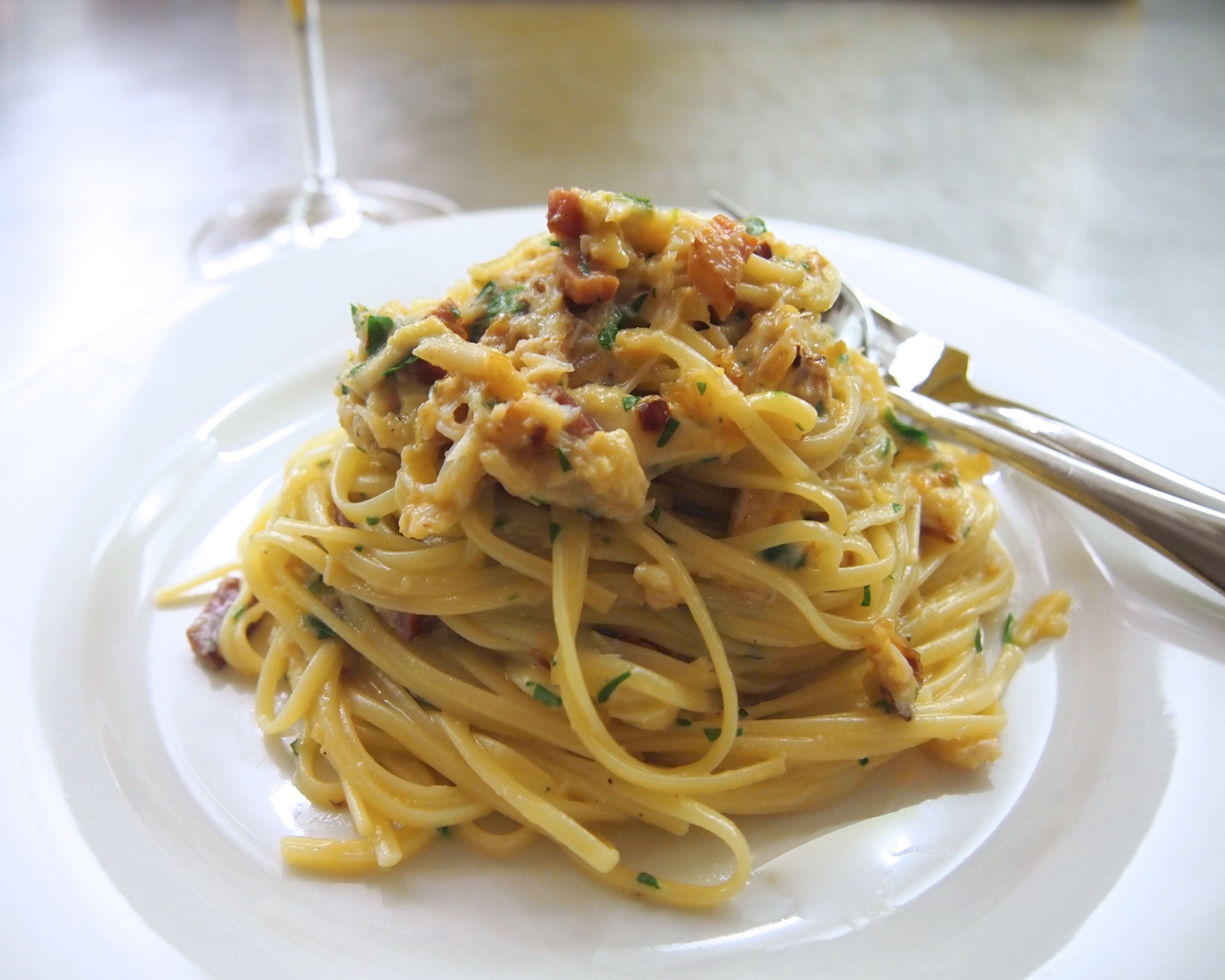 The Roman dish of spaghetti carbonara is one of the most adored pasta dishes in the world and rightly so. It has all the elements that make for perfect comfort food – a silky cheese laced sauce, salty pancetta and of course pasta. This version whilst not really traditional in that it incorporates crab meat, is still authentic in its execution i.e. it is made with pancetta, eggs and cheese – no cream please! The inclusion of crab meat makes this carbonara a little more special which is great if you’re entertaining and want to take things up a notch. Carbonara is normally served with spaghetti but in this instance I used linguine which I think works well with the crab. Whilst I love a traditional carbonara this crab meat version gives a nice little twist to a much loved classic without ruining its integrity.