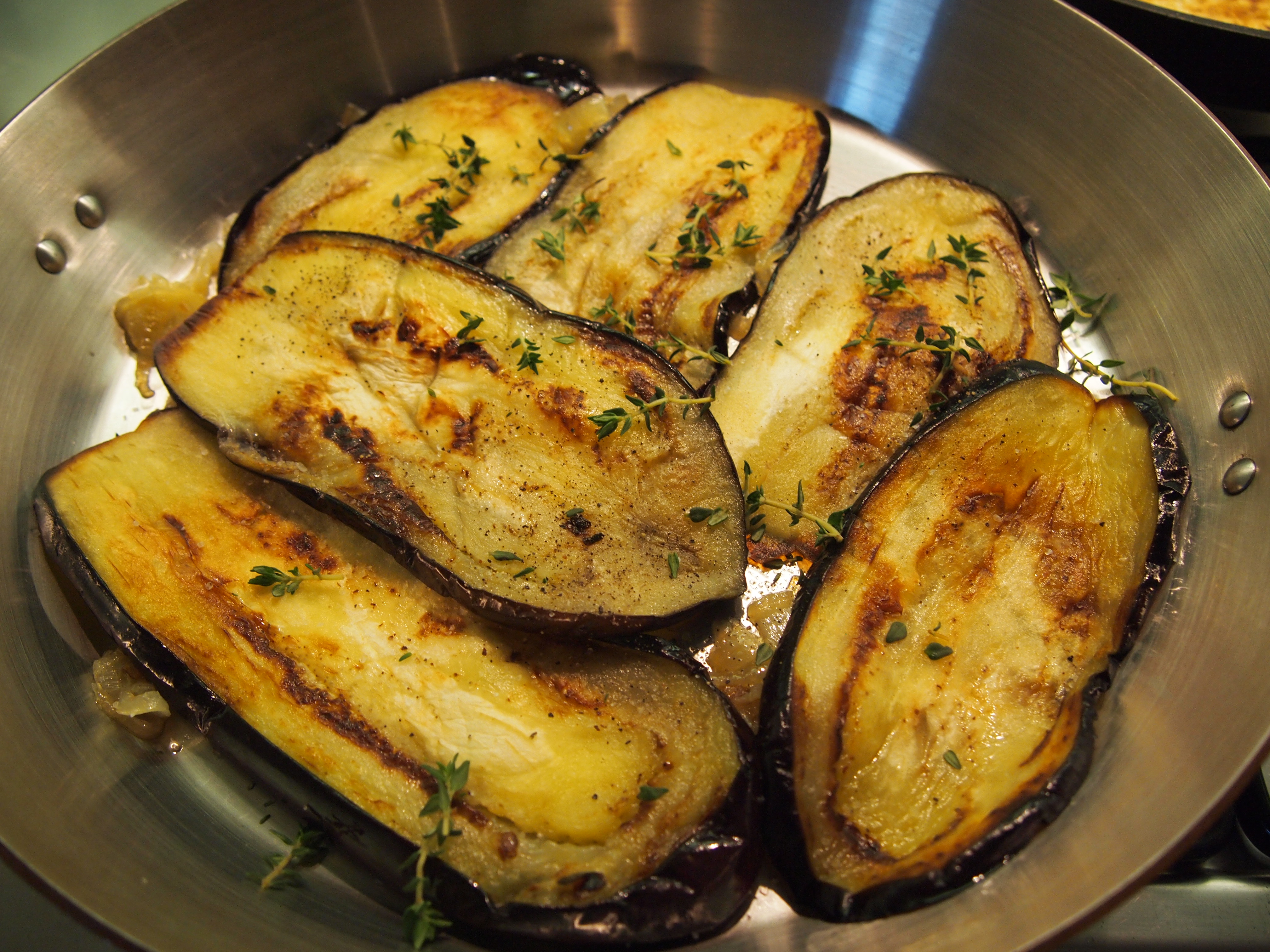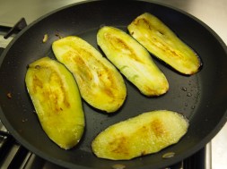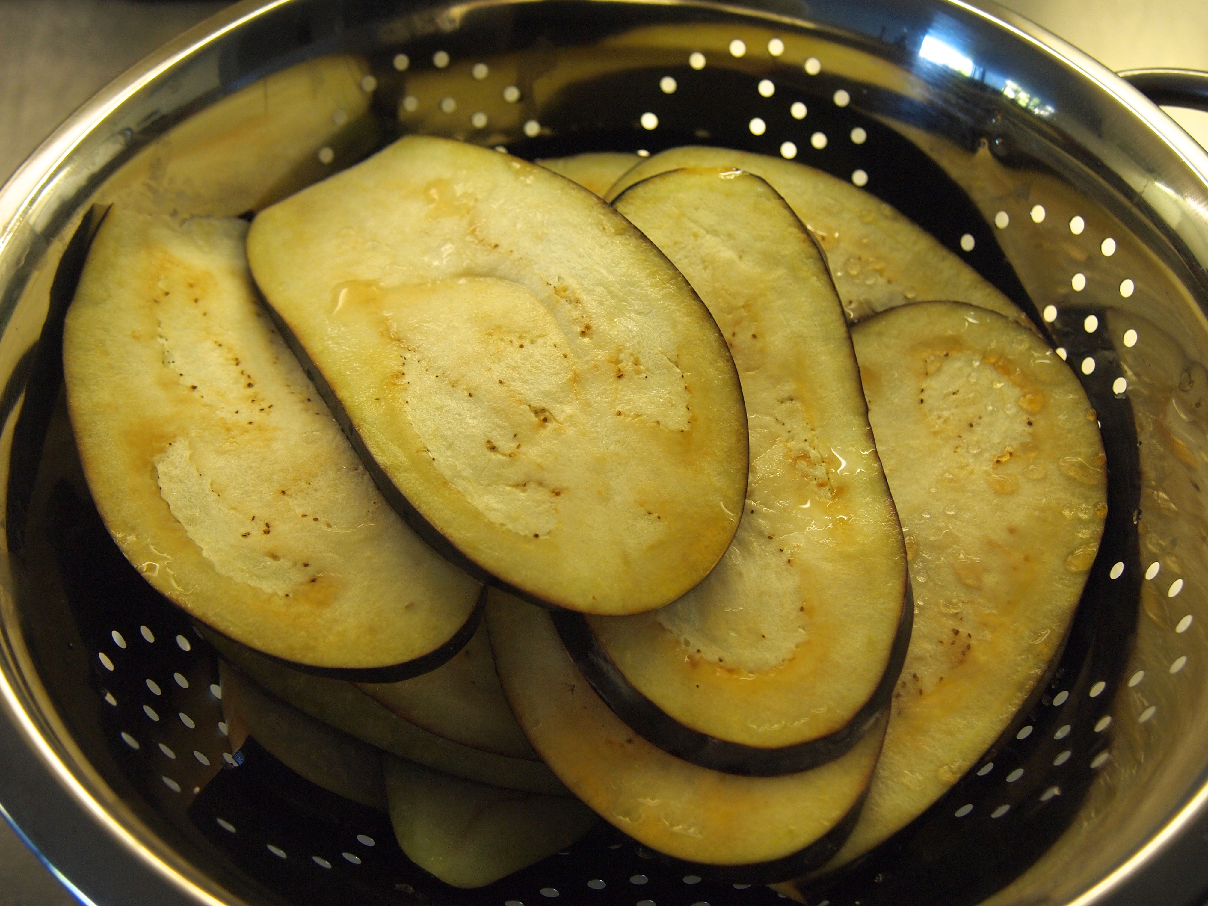 Put more olive oil into the pan and add the rinsed eggplant. You will have to do this in batches. As each slice starts to colour, turn it over, then when all are lightly golden – though far from brown – drain them thoroughly on kitchen roll (essential if there is not to be too much oil in the finished dish).