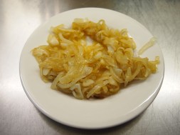 When the eggplant has relaxed (each piece will go a bit floppy) peel and thinly slice the onion and cook it in a little olive oil over a medium heat till it has softened, but stop before it colours. Peel and slice the garlic and add it as the onion cooks. Lift out the onion and garlic and set aside.
