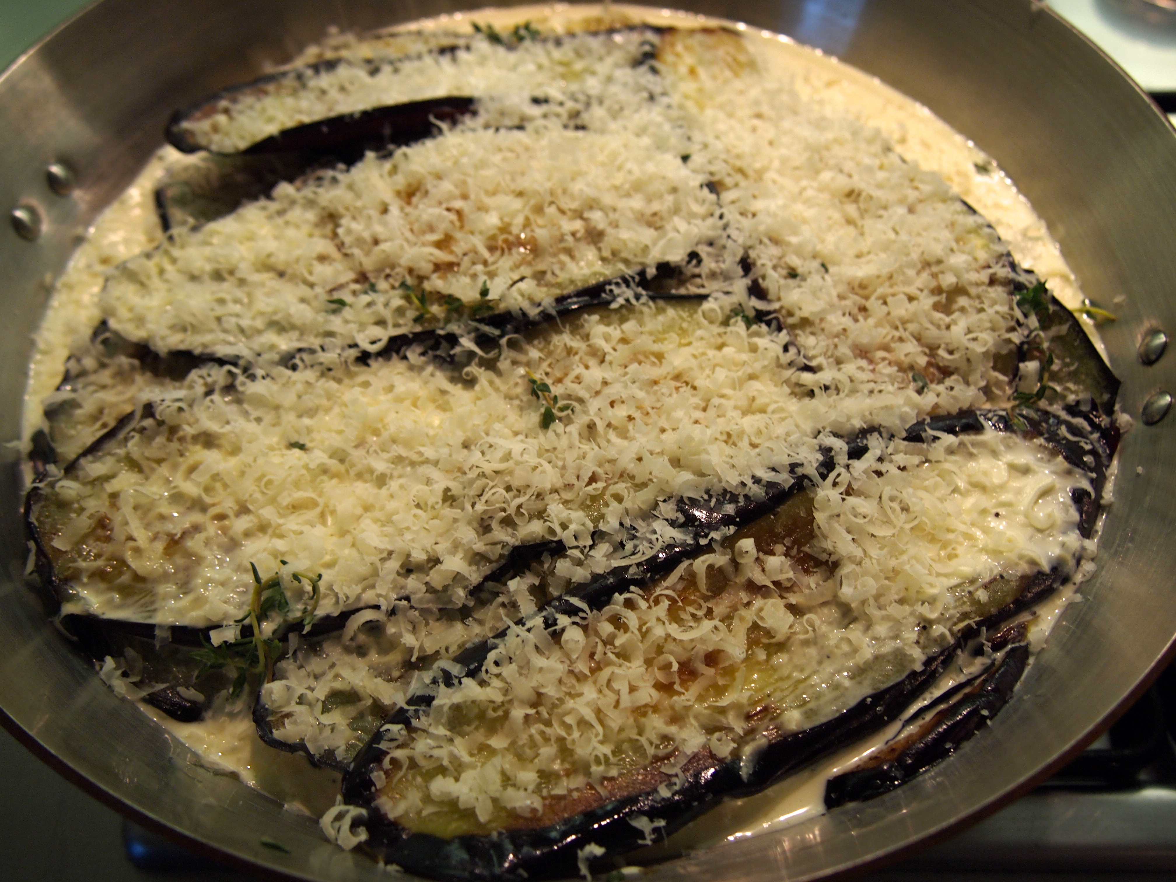 Layer the eggplant and onions in a shallow baking dish, scattering salt, black pepper and thyme as you go. Pour the cream over the eggplant. Evenly sprinkle over the Parmesan and bake at 180C for 40-45 minutes until bubbling and lightly browned here and there.